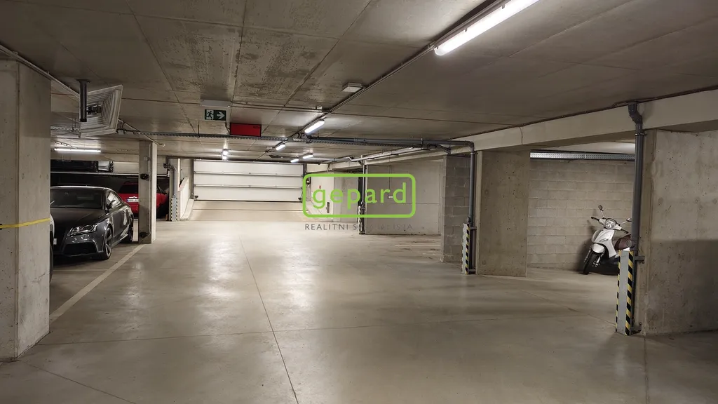 K bytu náleží sklepní kóje a vyhrazené parkovacího stání v suterénu domu. Vjezd do garáže je vyhřívaný, vjezdová brána ovládaná mobilem nebo dálkovým ovladačem.