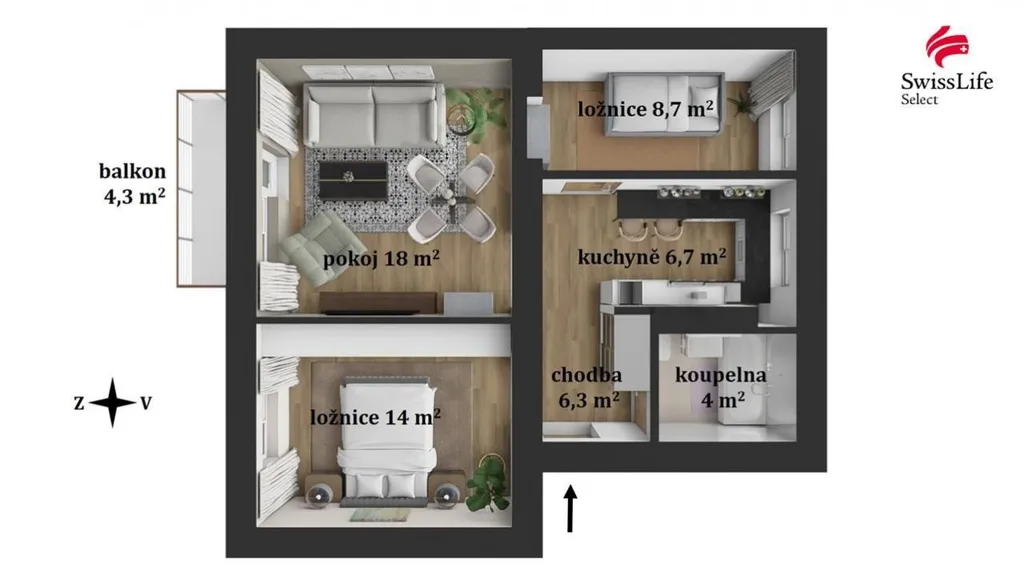 Denní rytmus bytu podporuje jeho orientace. Kuchyň směřuje na východ a nabízí příjemné světlo hned od rána. Obývací pokoj a ložnice jsou orientované na západ, takže odpoledne a večer působí byt klidně a vyváženě. Z obývacího pokoje je přímý vstup na balkon, který se přirozeně využívá jako prodloužení obytného prostoru.
