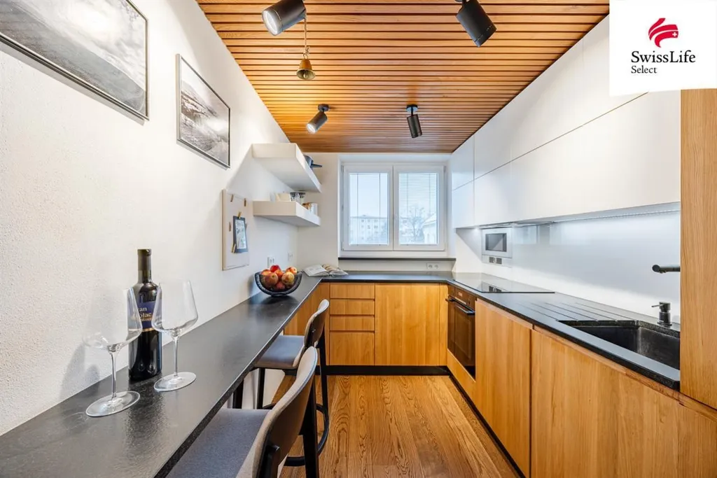 K bytu náleží prostorný sklep, kam se pohodlně vejde kolo, sportovní vybavení i sezónní věci. Cena bytu je včetně vybavení zhotoveného na míru, které bylo navrženo přímo pro tento prostor a tvoří jeho přirozenou součást.