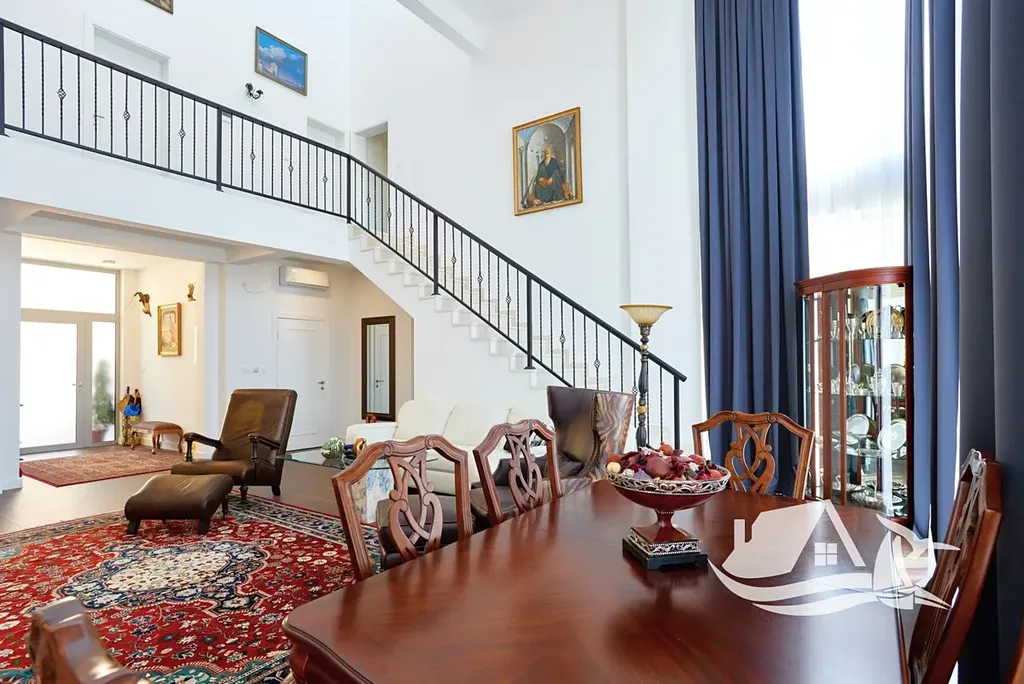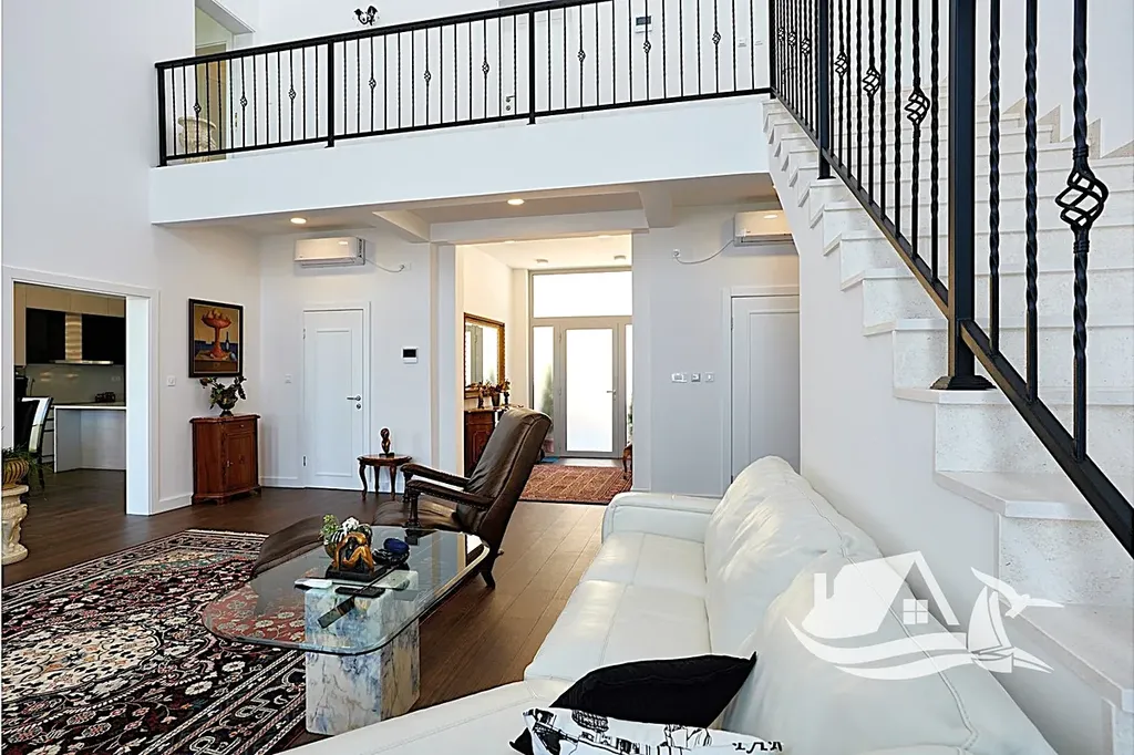Nemovitost o celkové ploše 338 m² je rozložena do dvou podlaží a nabízí plnohodnotné rodinné bydlení s dostatkem prostoru pro hosty i dlouhodobé pobyty. Přízemí tvoří otevřený obytný prostor propojující obývací pokoj, jídelnu a kuchyni, dále pracovna nebo ložnice pro hosty, dvě koupelny, technická místnost a krytá terasa. Celé přízemí je vybaveno podlahovým vytápěním a díky vysokým stropům dosahujícím až osmi metrů a velkoformátovým francouzským oknům působí interiér mimořádně vzdušně, svěže a plný denního světla. Výhled na moře je zde přirozenou součástí každodenního života.