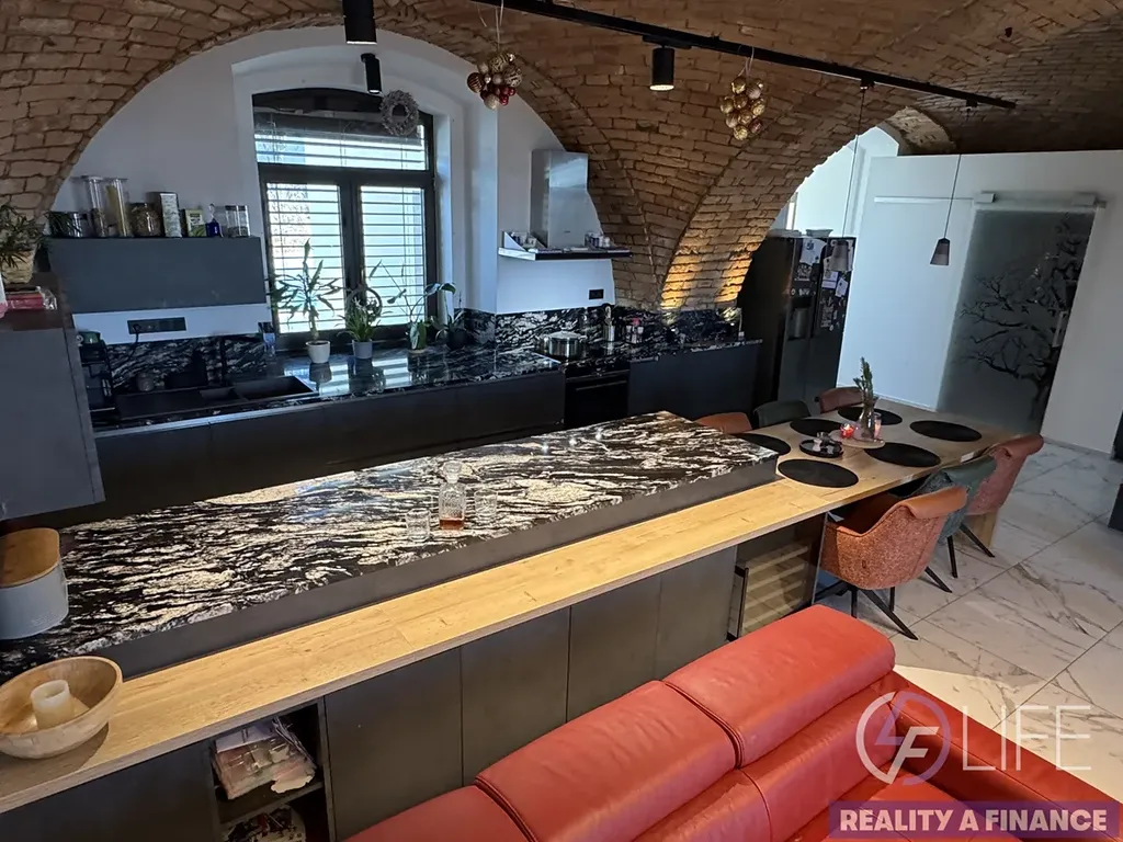 Dominantou domu je velkorysý obytný prostor s kuchyní a jídelnou, kde byly zachovány původní historické klenby. V kombinaci s žulovou dlažbou a pečlivě vybranými materiály vzniká harmonický celek, který přirozeně propojuje minulost s moderním komfortem.