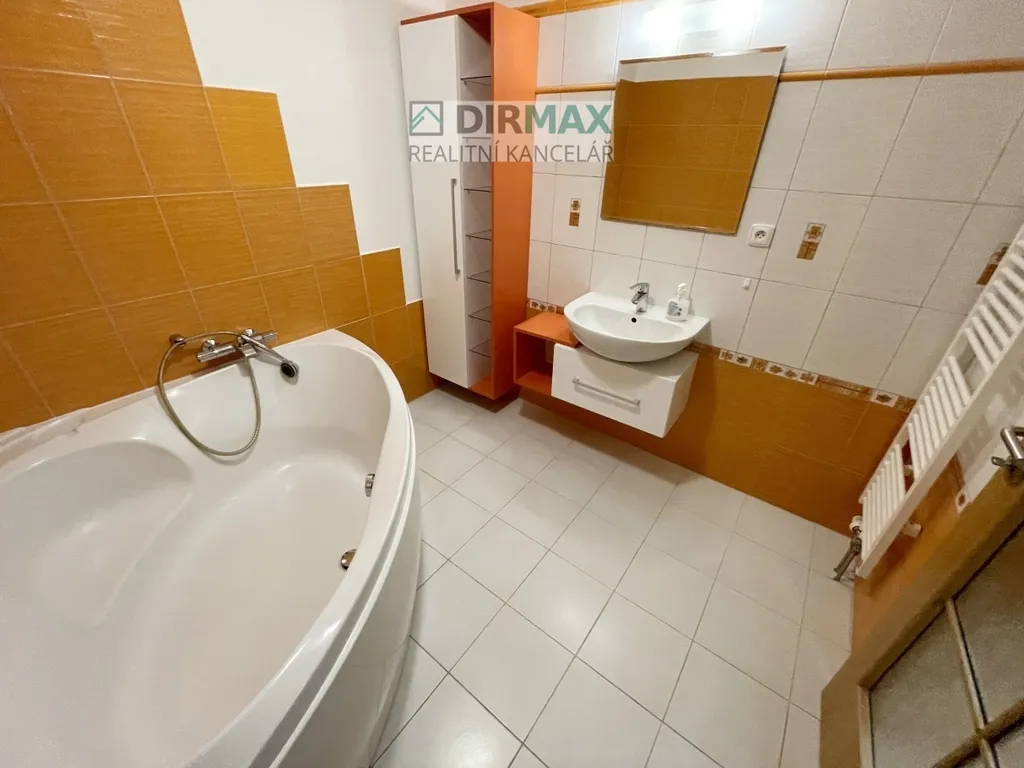 V koupelně je skutečně velká rohová vana, umyvadlo, úložné skříňky, topný žebřík, zrcadlo a koupelnový ventilátor. Přípojka na pračku, případně sušičku je.