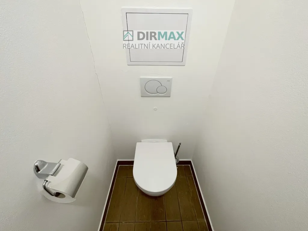 Toaleta je pak zcela samostatně. Přímo naproti toaletě je vstup do komory s vestavěnou skříní a policemi.