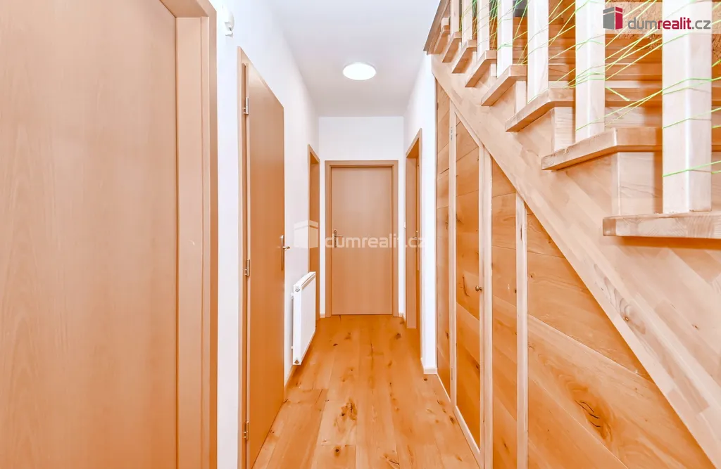 Z chodby vedou dřevěné schody do obytného podkroví (38m²), kde je dostatek místa na hraní a učení, krásná velká koupelna, lůžka a úložné prostory jsou chytře umístěné ve zkoseném prostoru a vedle schodiště volně přístupná pracovna ze které jde udělat další pokoj.