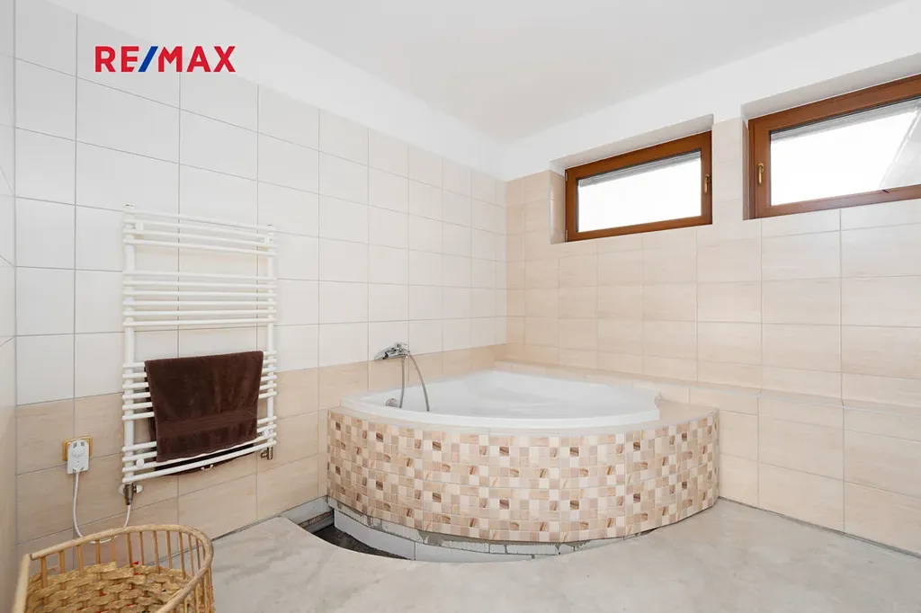 Nedokončená koupelna s vanou má možnost dodělat sprchový kout . WC je samostatné.
