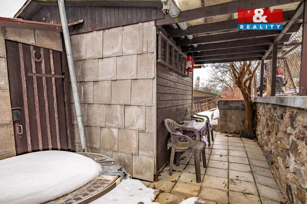 Zahrada je terasovitě řešena do kamenných kaskád a jednotlivé části jsou pohodlně přístupné po nově vybudovaných schodech. Chatka je propojena s nově vydlážděnou terasou se stříškou, která nabízí příjemné místo pro venkovní posezení či grilování.