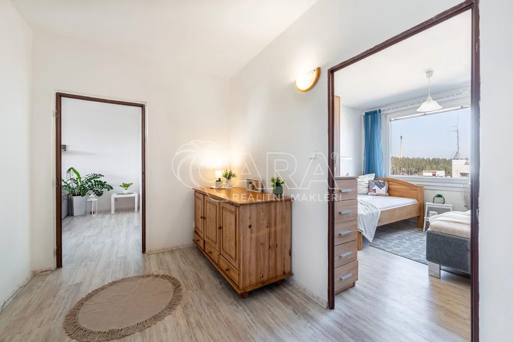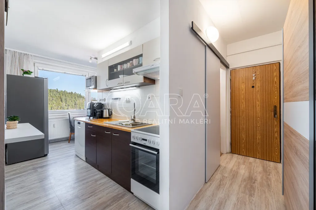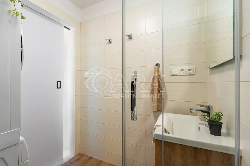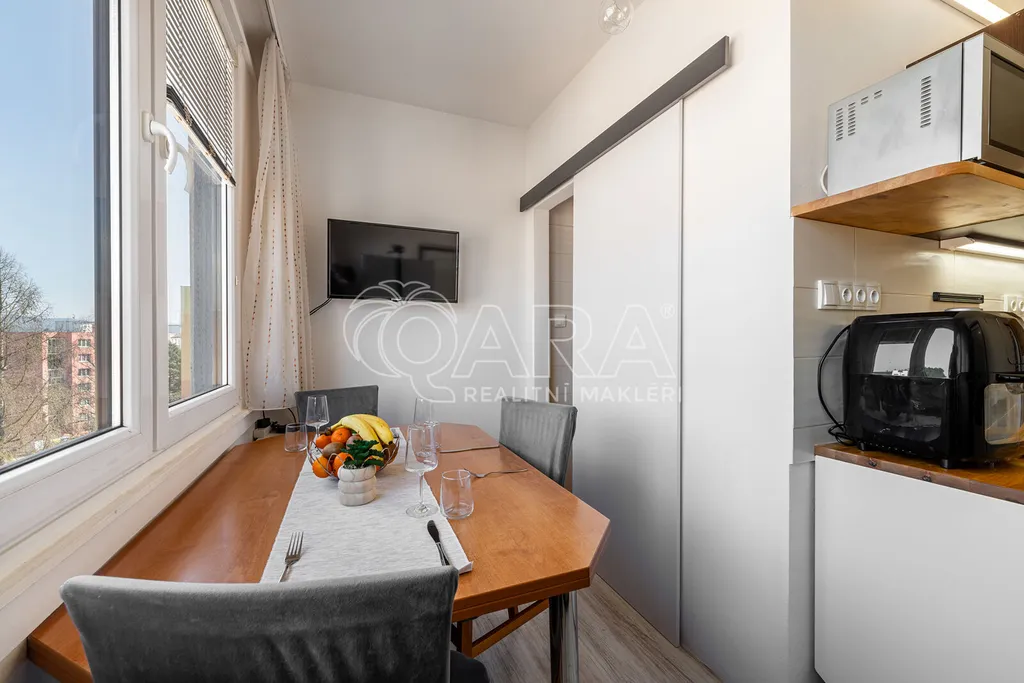 Byt se nachází v posledním patře a disponuje vstupní chodbou, koupelnou se sprchovým koutem a WC, zrekonstruovanou kuchyní, obývacím pokojem a ložnicí s šatnou. Byt je vytápěn dálkově, stejně tak i ohřev vody. K bytu dále náleží prostorný sklep, který je možné využít ke skladování. Společná kolárna a sušárna se nachází v přízemí domu. Úklid společných prostor se řeší rozpisem služeb.