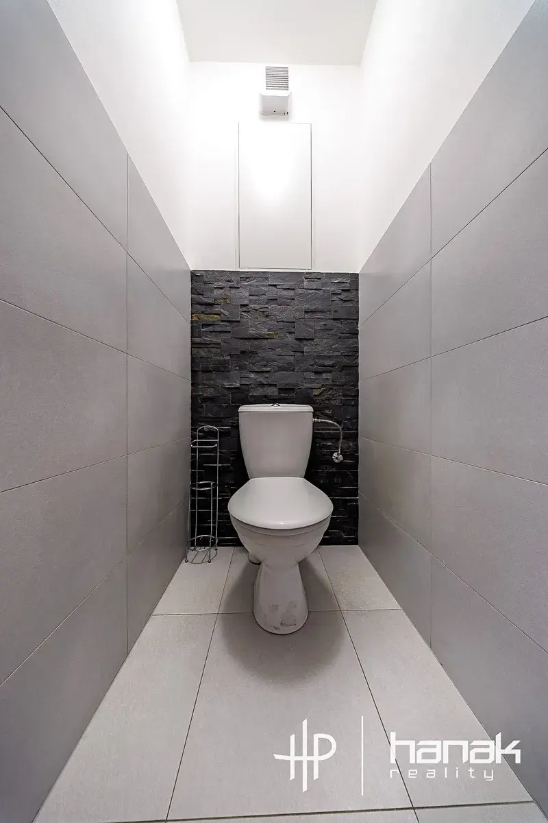 Dispozice bytu nabízí zádveří s úložným prostorem, oddělenou toaletu, koupelnu s vanou, umyvadlem a místem pro pračku se sušičkou. Z chodby je dále vstup do praktické šatny, velké pracovny - kterou je možné využívat i jako pokoj a do ložnice s manželkou postelí a vestavěnou skříní.