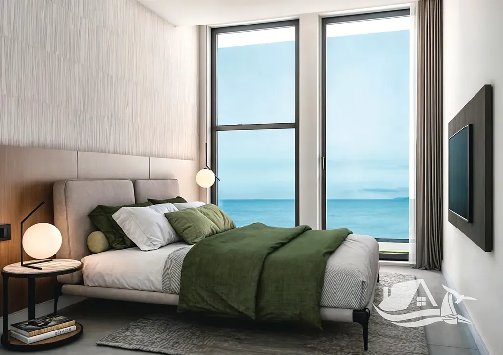 Apartmán v druhem patře dispozice 3+kk nabízí prostorný obývací pokoj s panoramatickými okny a kuchyňským koutem, moderní ložnici, elegantní koupelnu a terasu o velikosti 6,2 m², ideální pro ranní kávu i večerní posezení s výhledem na moře. Celková plocha jednotky činí 74 m² a poskytuje vyvážený poměr mezi komfortem a efektivním využitím prostoru.