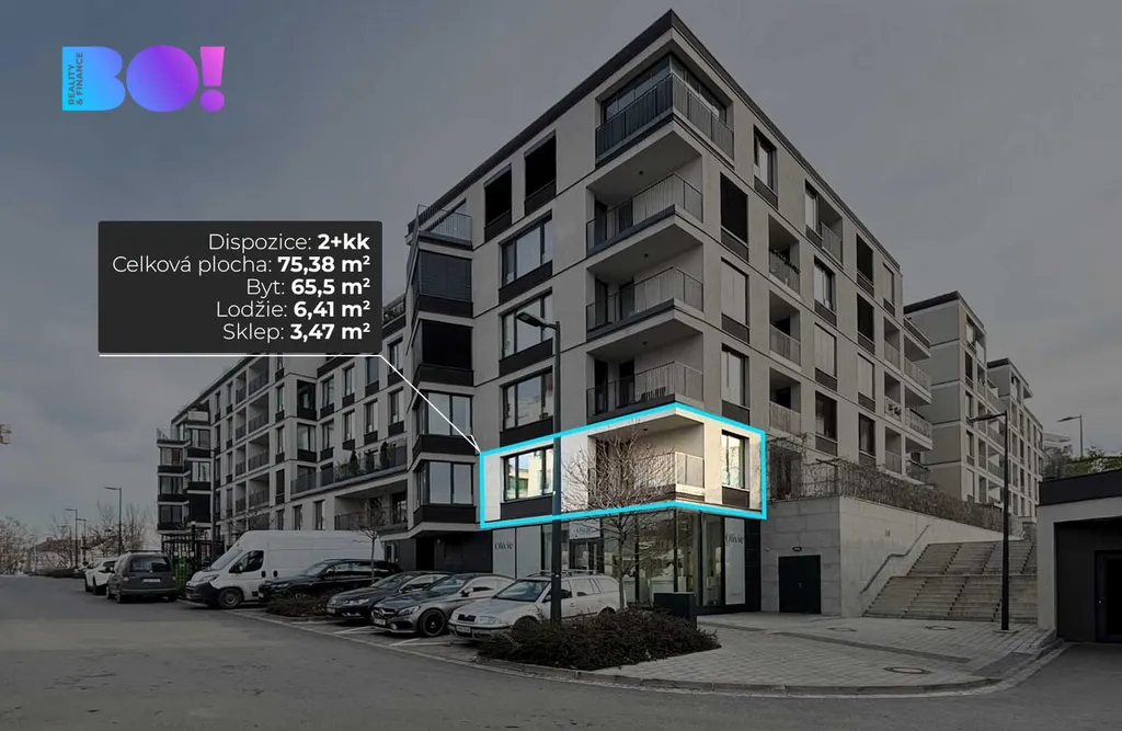 Byt 75,38 m² s lodžií 6,41 m² a sklepem 3,47 m² je šikovně dispozičně řešen tak, aby nabízel dostatek prostoru pro komfortní bydlení i reprezentativní pracovní zázemí.