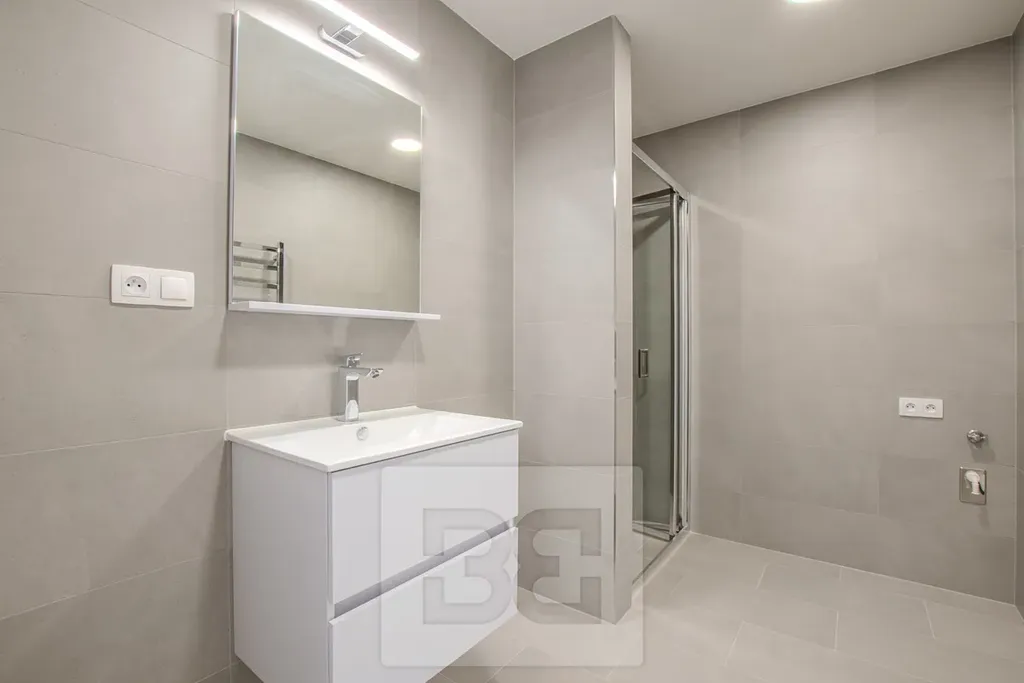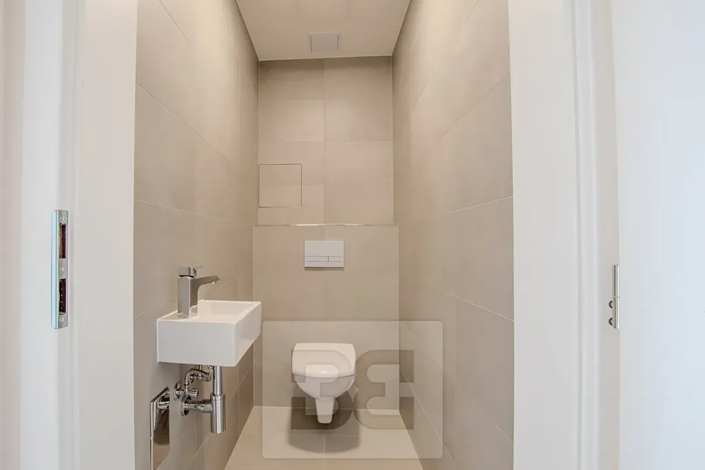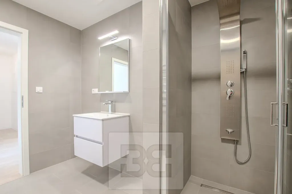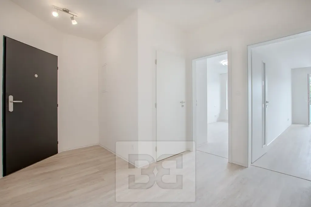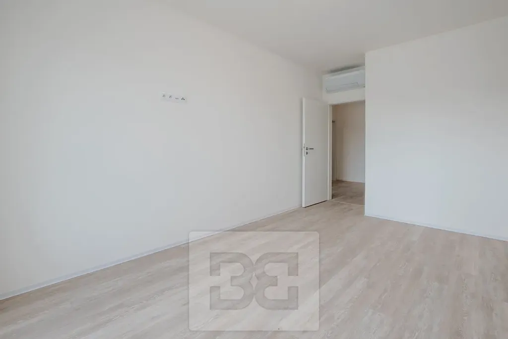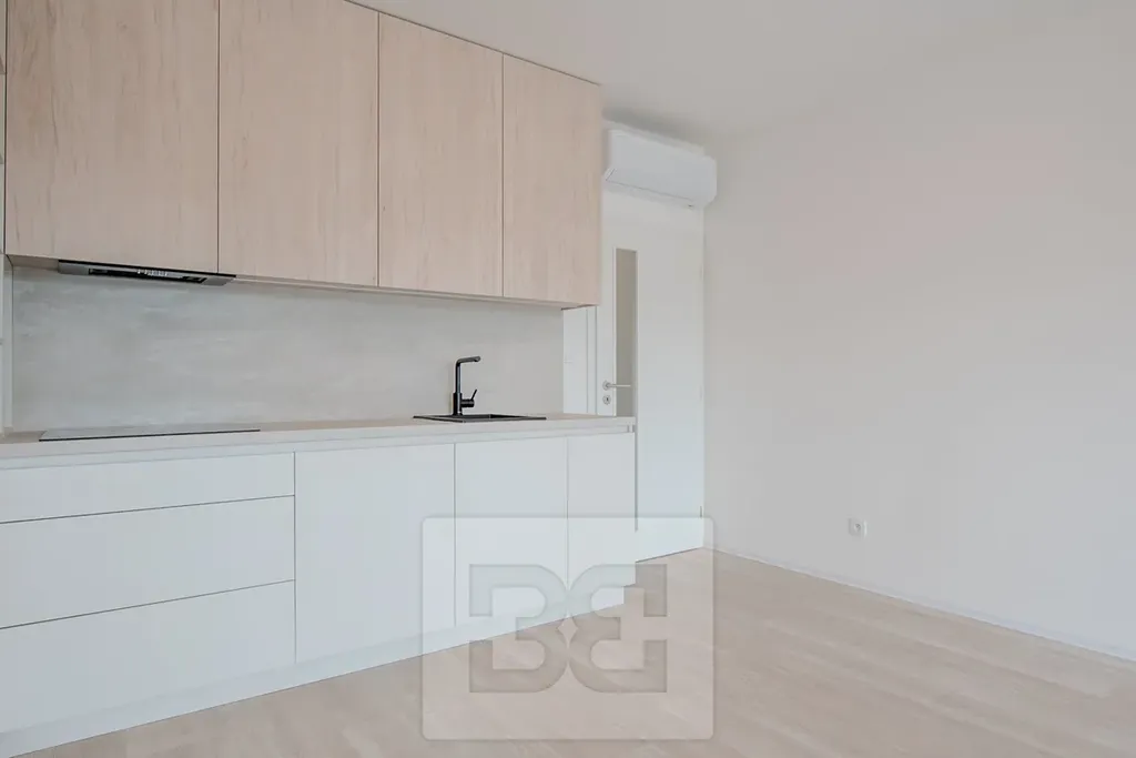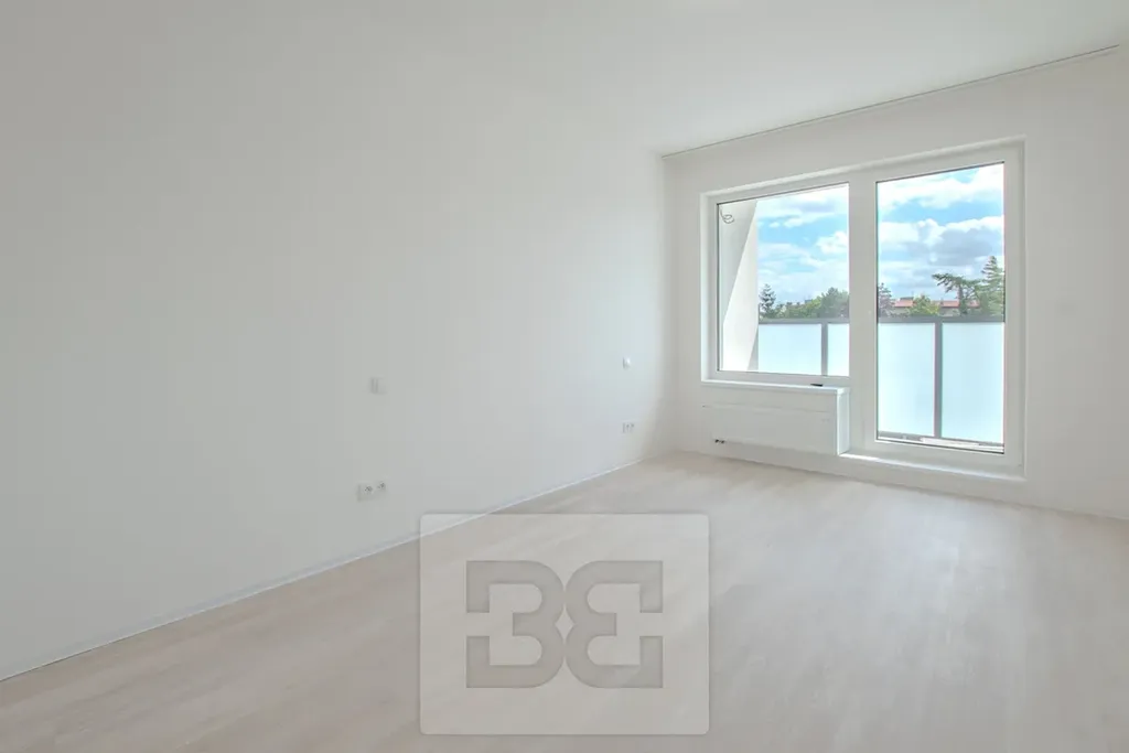 Součástí bytu je prostorný obývací pokoj s kuchyňským koutem o ploše 26 m², který je vybaven moderní kuchyňskou linkou s množstvím úložných prostor a vestavěnými spotřebiči – lednicí s mrazákem, troubou s mikrovlnnou troubou, myčkou, indukční varnou deskou a digestoří. Z obývacího pokoje je vstup na balkon o rozloze více než 4 m², orientovaný na jih a nabízející příjemný výhled. Druhý pokoj disponuje vlastní lodžií o velikosti 3 m². Komfort bydlení zajišťuje klimatizace v obou pokojích, prostorná koupelna se sprchovým koutem, samostatná toaleta, šatna a velkorysá vstupní chodba. V celém interiéru je položena kvalitní vinylová podlaha.