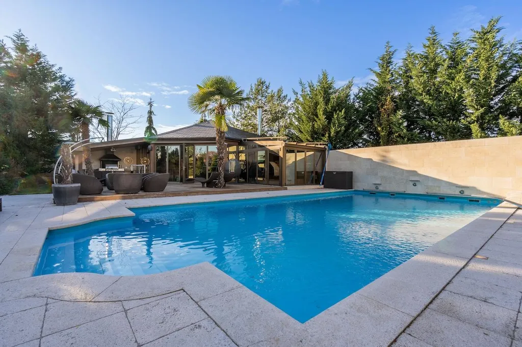 Na zahradě jsou pak citlivě rozmístěny části s různým využitím. Dominantní je zahradní altán, který obsahuje společenskou místnost, pracovnu, „vířivku“, kuchyň, koupelnu, krb, gril i hernu v jednom. Venkovní bazén je obklopen vzrostlou a udržovanou zelení, vč. palem a na své si přijdou i děti na dětském hřišti či milovníci buřtů u ohniště. Jezírko s červenými kapry je pak již třešničkou na dortu.