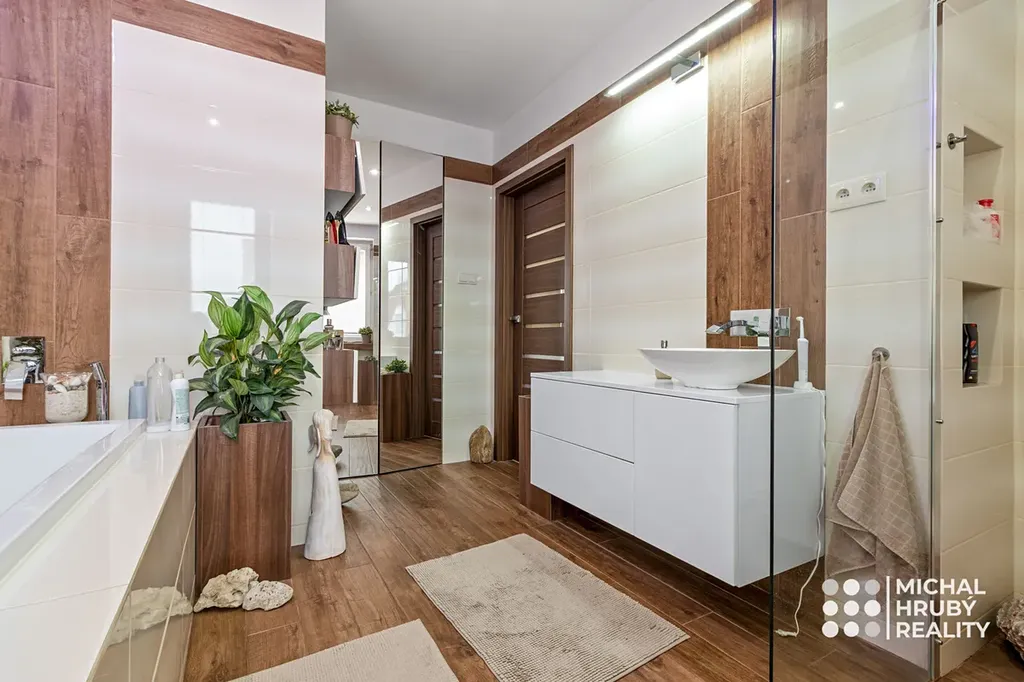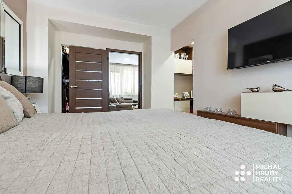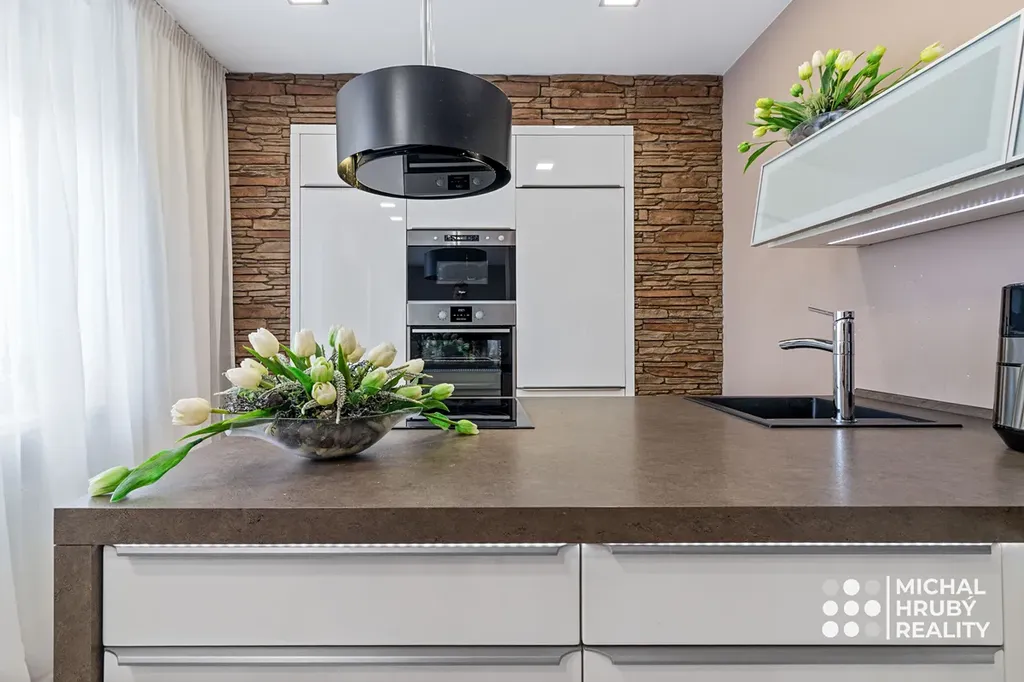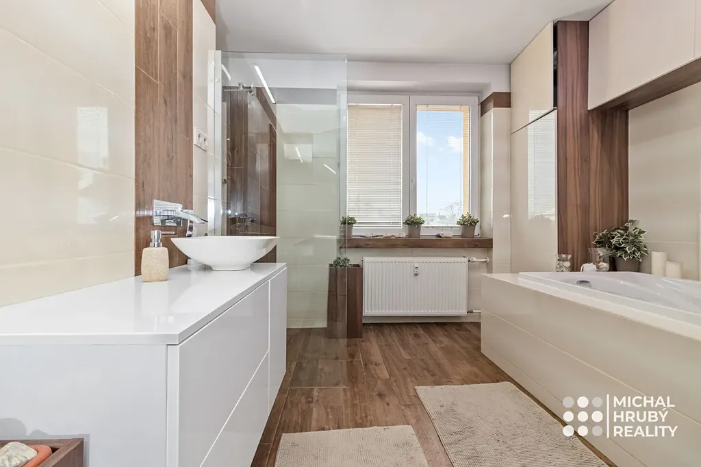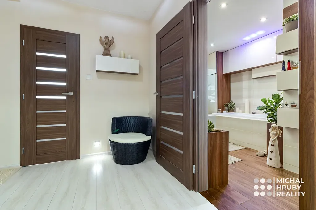 Například dominantní obývací pokoj spojen s kuchyní, která stylově zapadá do konceptu celého bytu. Spotřebiče zabudované stylově přímo do stěny spolu s praktickou spíží. Nebo koupelnu, která je jednou z nejhezčích, jakou jsem kdy v bytě viděl. Vznikla z původního pokoje, takže je nadstandardně velké, najdete v ní vanu i sprchový kout, vše opět ve vysokém standardu.