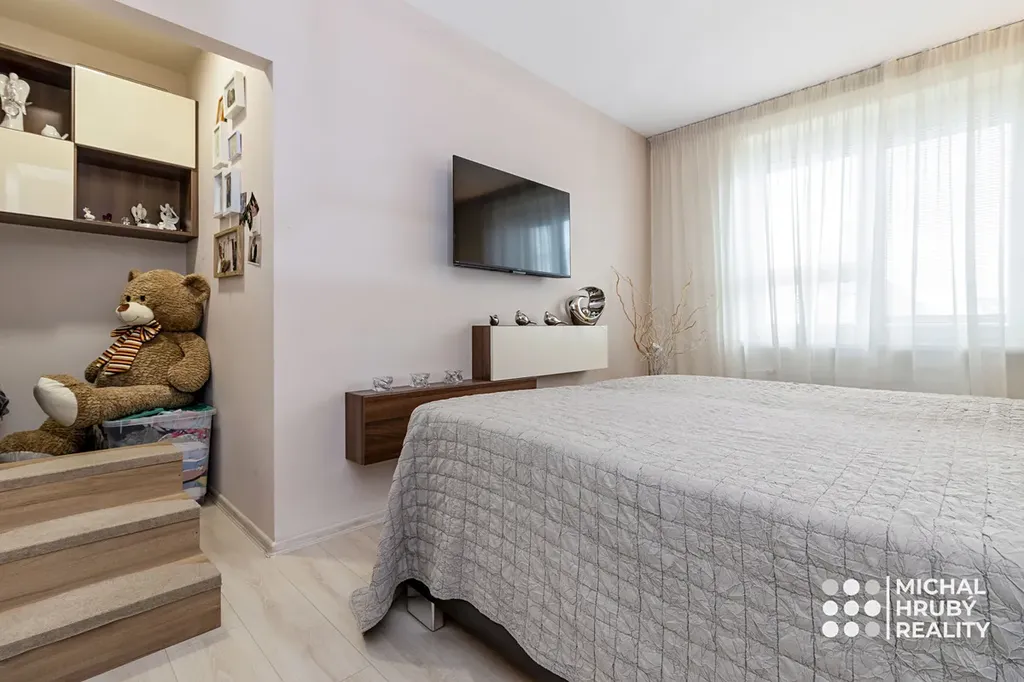 Tenhle byt vznikl přestavbou původního třípokojového bytu. Pokud chcete něco opravdu jedinečného, tady si to užijete naplno. Užitná plocha 79 m2 je až nadstandardně komfortní a navrch získáte pár praktických věcí.