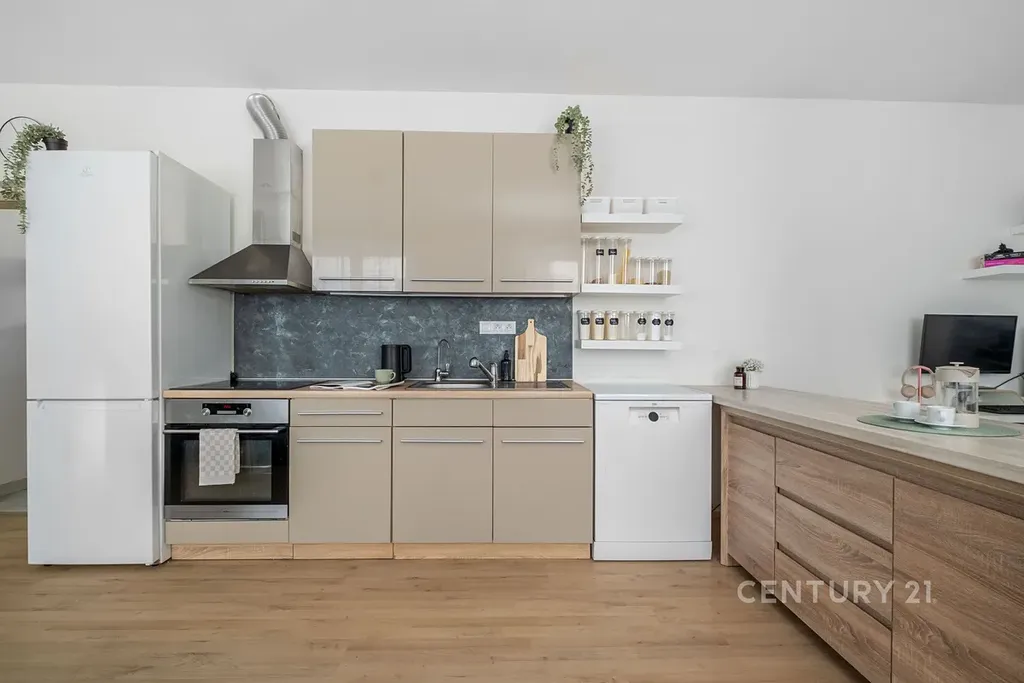 Obývací pokoj s kuchyňským koutem nabízí dostatek prostoru pro každodenní život i posezení s přáteli. Kuchyň je vybavena kuchyňskou linkou se zabudovanou troubou, sklokeramickou varnou deskou a digestoří s odtahem. U dřezu je instalovaný kvalitní vodní filtr eSpring. Vybavení bytu je na dohodě. V obytných místnostech jsou plovoucí podlahy, doplněné dlažbou v ostatních částech bytu, což je praktické řešení z hlediska údržby.