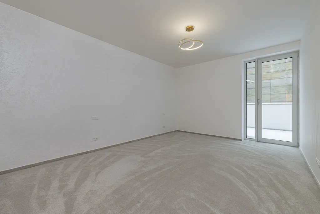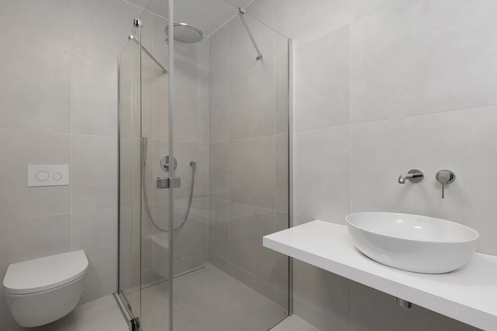 Interiér bytu je připraven jako kvalitní základ pro finální doladění dle osobního vkusu nového majitele. Dokončeny jsou podlahy (kombinace dlažby a koberců), hlavní koupelna v předsíni se sprchovým koutem a toaletou, stejně jako kuchyňská linka SÝKORA na míru včetně vestavných spotřebičů – lednice, trouby, mikrovlnné trouby, varné desky s integrovanou digestoří, vinotéky a kávovaru. Součástí obytného prostoru je také TV stěna na míru. K dokončení zbývají zárubně a dveře ve třech místnostech, koupelna přístupná přímo z ložnice a koncové prvky osvětlení, což dává prostoru možnost finální individualizace.