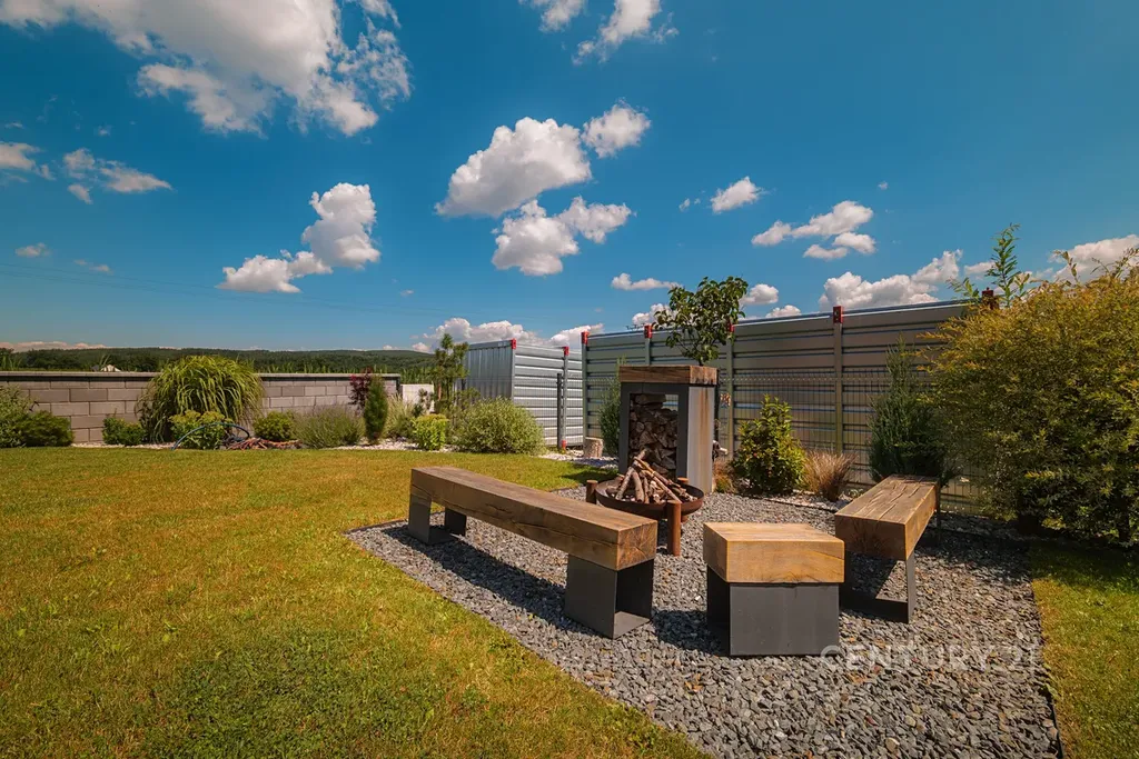 Zahrada byla zpracována specializovanou firmou. Je zde dostatečný prostor pro bazén a zahrada nabízí dostatek soukromí. Majitelé mají dvě terasy jednu s jídelní sestavou a druhou s venkovní sedací soupravou.