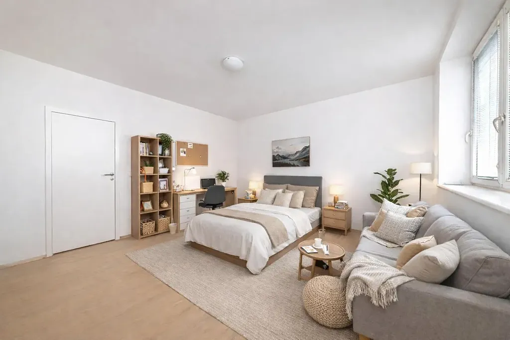Dominantou bytu je prostorný a světlý obývací prostor s moderním kuchyňským koutem, který nabízí ideální spojení vaření, stolování i relaxace v jednom vzdušném celku. Z obytné místnosti je přímý vstup do druhého pokoje, vhodného jako ložnice a pracovna. Koupelna s toaletou je řešena účelně a čistě, zatímco praktická komora poskytuje vítaný úložný prostor pro potraviny i každodenní domácí potřeby.