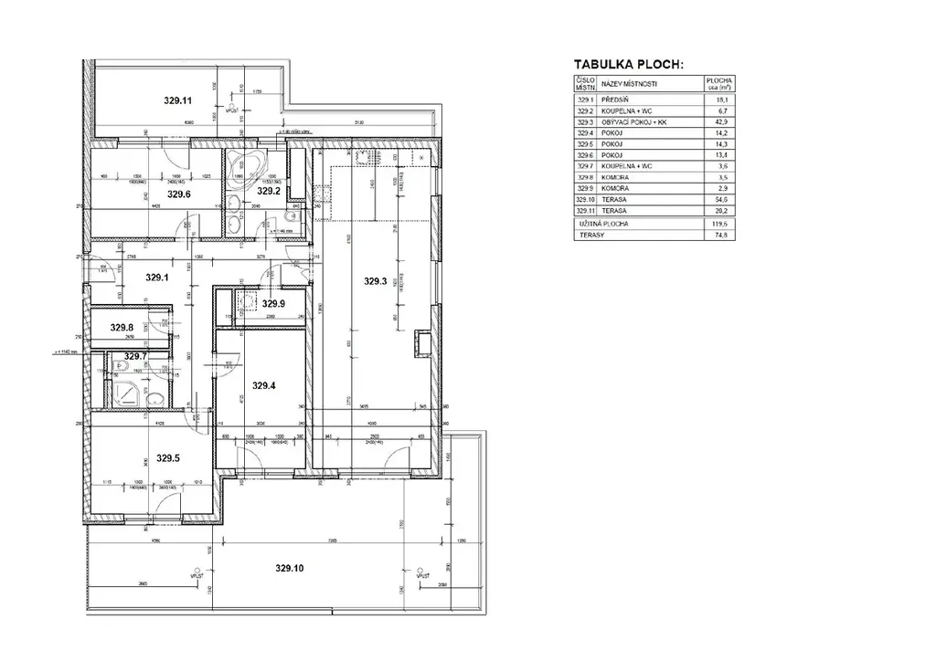 - užitná plocha bytu včetně teras má celkem 204 m2