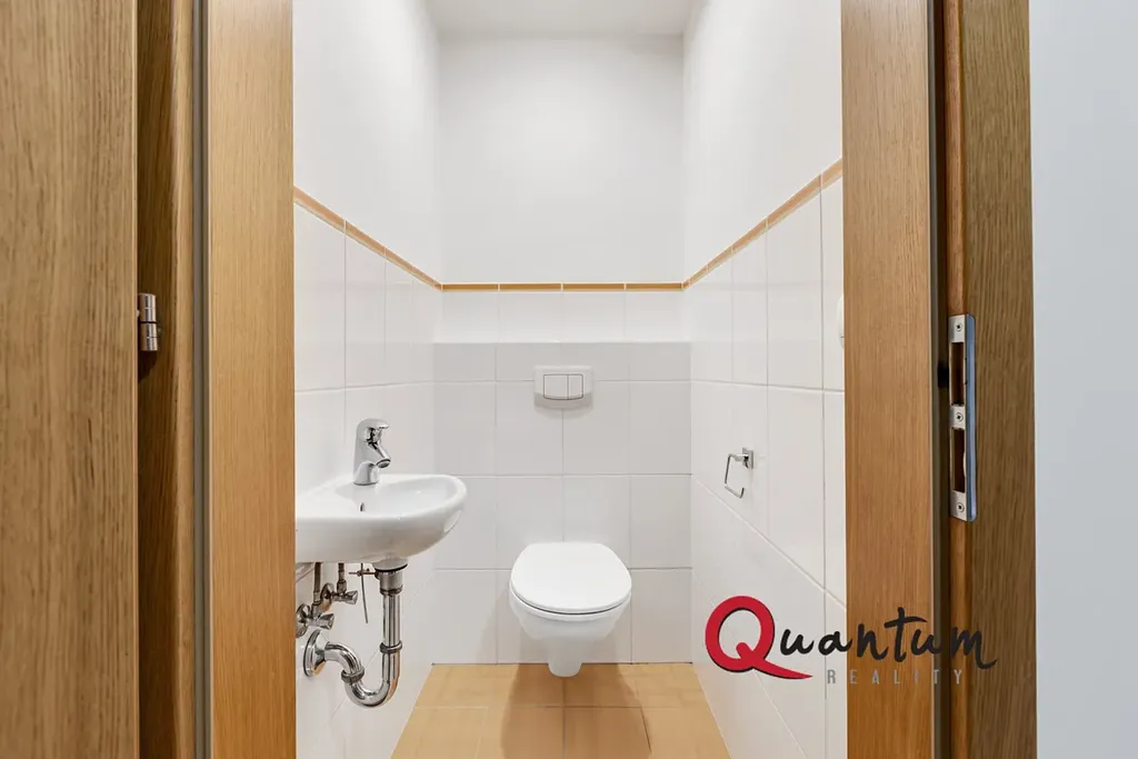V koupelně najdete sprchový kout i vanu. Velkým benefitem je samostatná, opravdu prostorná šatna v ložnici a vestavěné skříně na chodbě, takže úložného prostoru je tu víc než dost.