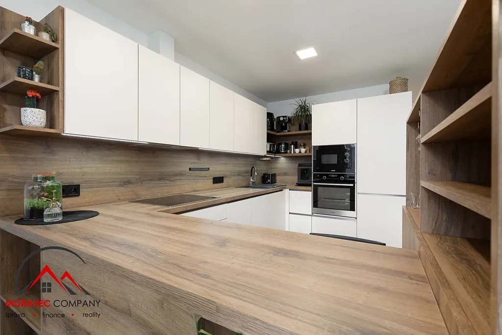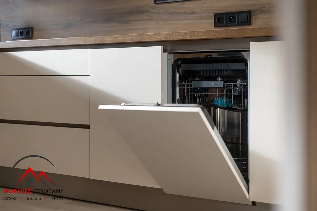 Součástí vybavení je moderní kuchyňská linka s vestavěnými spotřebiči – varná deska, trouba, myčka, lednice a mikrovlnná trouba. V koupelně je sprchový kout a toaleta. Praktickým bonusem je samostatná komora a velké množství úložných prostor.