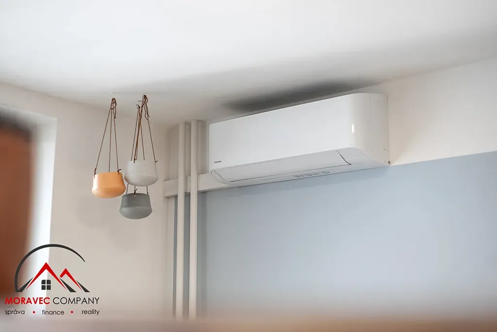 K dispozici zůstává také částečné vybavení: jídelní stůl se židlemi, rám postele a pračka i sušička. Velkým komfortem je klimatizace, která zajistí příjemnou teplotu i během horkých letních dní.