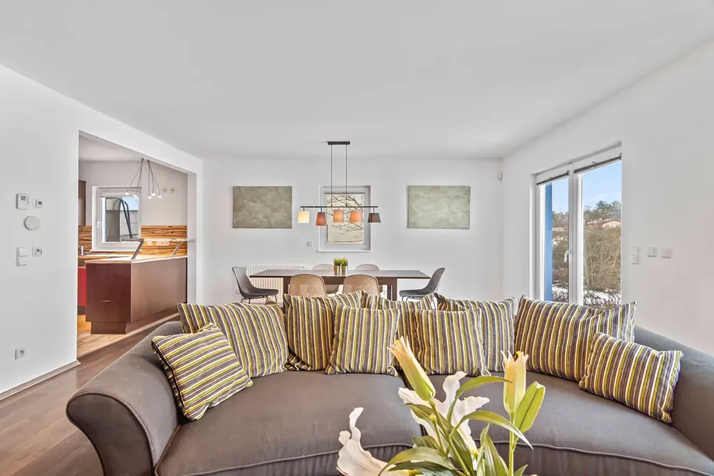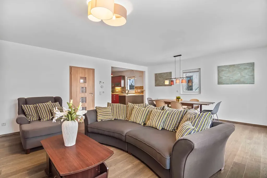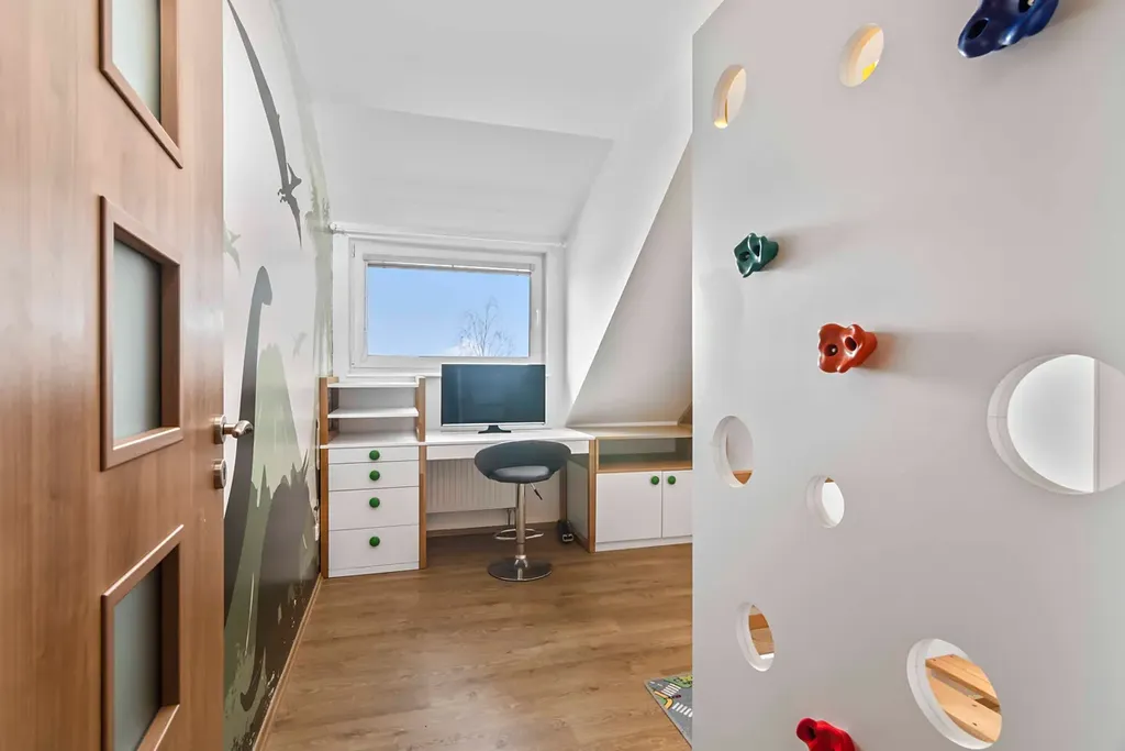 Dispoziční řešení domu je velmi praktické a vyhovující rodinnému bydlení. V přízemí se nachází pracovna, prostorný obývací pokoj propojený s kuchyňským koutem, technická místnost a koupelna. Z obývacího pokoje je přímý vstup na dvě terasy o velikosti 2×25 m², z nichž jedna je zastřešená. Terasy plynule navazují na vzrostlou a udržovanou zahradu. V patře domu jsou umístěny dva dětské pokoje, ložnice, praktická šatna a druhá koupelna s vanou a WC. K dispozici jsou dva půdní prostory. Z prvního vznikla podkrovní herna pro děti a druhý nad garáží slouží jako velkorysý úložný prostor pro sezónní věci.