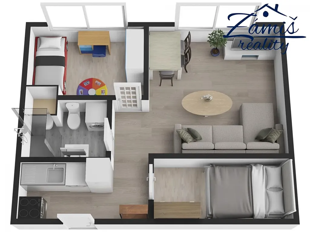 Velký pokoj je rozdělen lehkou příčkou, čímž vznikla oddělená ložnice.