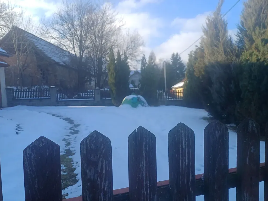 Celý pozemek je oplocený, příjezd je po obecním pozemku k vratům.