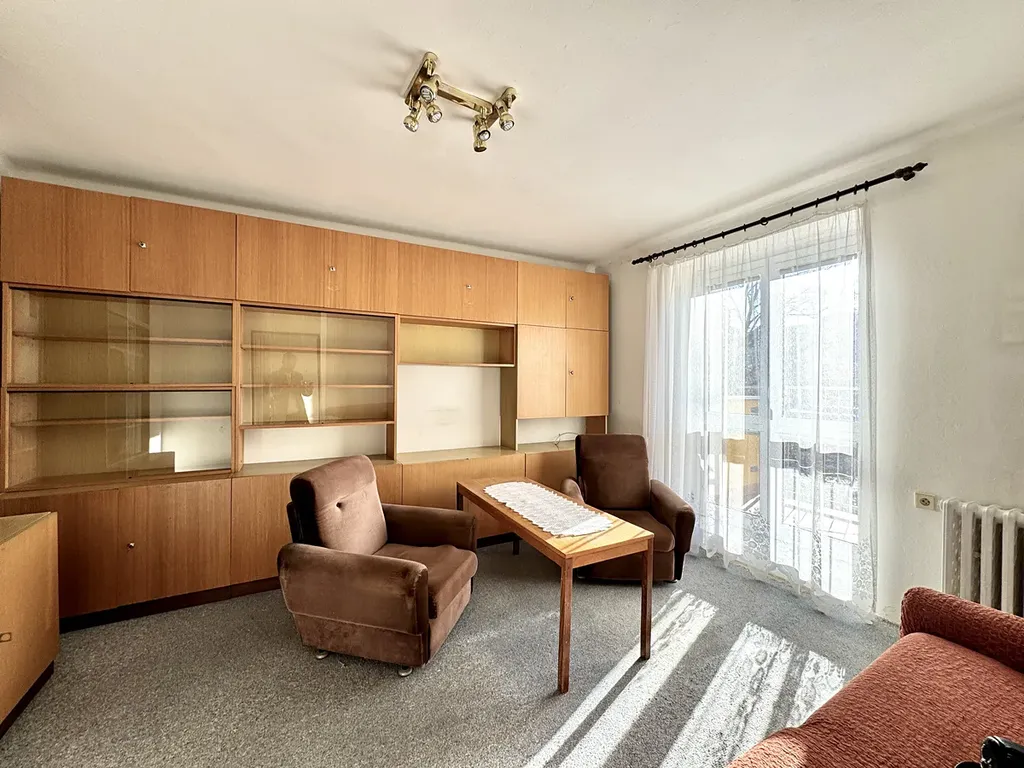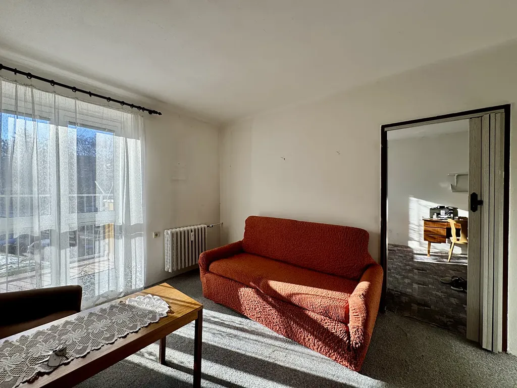 Byt je v původním stavu a skládá se z předsíně, odděleně řešené koupelny a toalety, kuchyně, obývacího pokoje a ložnice. Z chodby je přístup do kuchyně a obývacího pokoje. Do ložnice je přístup z kuchyně nebo obývacího pokoje. Z obývacího pokoje se dostanete na balkon. V kuchyni je linka s plynovým sporákem. Okna v bytě jsou plastová. K bytu také patří sklepní kóje (2 m2). Sousedé a celkově vchod je klidný a čistý.