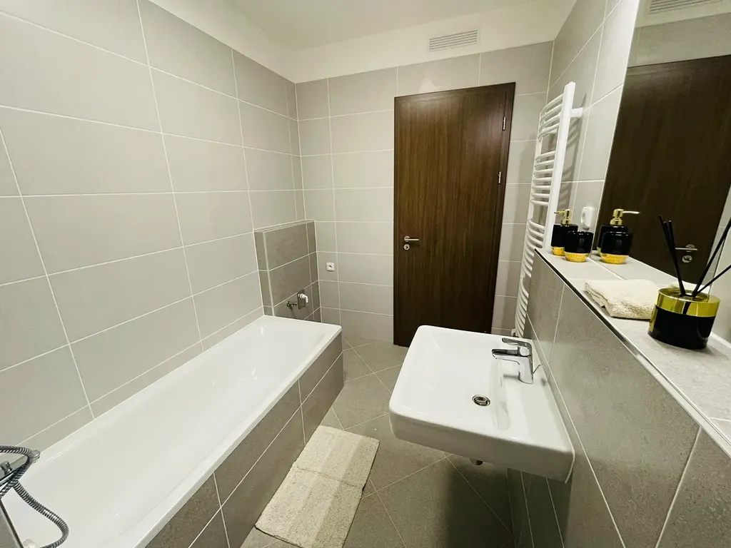 V koupelně vana se zástěnou na sprchování, topný žebřík a závěsné WC, dále interiérové dveře, plastová okna, plovoucí podlaha a dlažba, protipožární vchodové dveře.