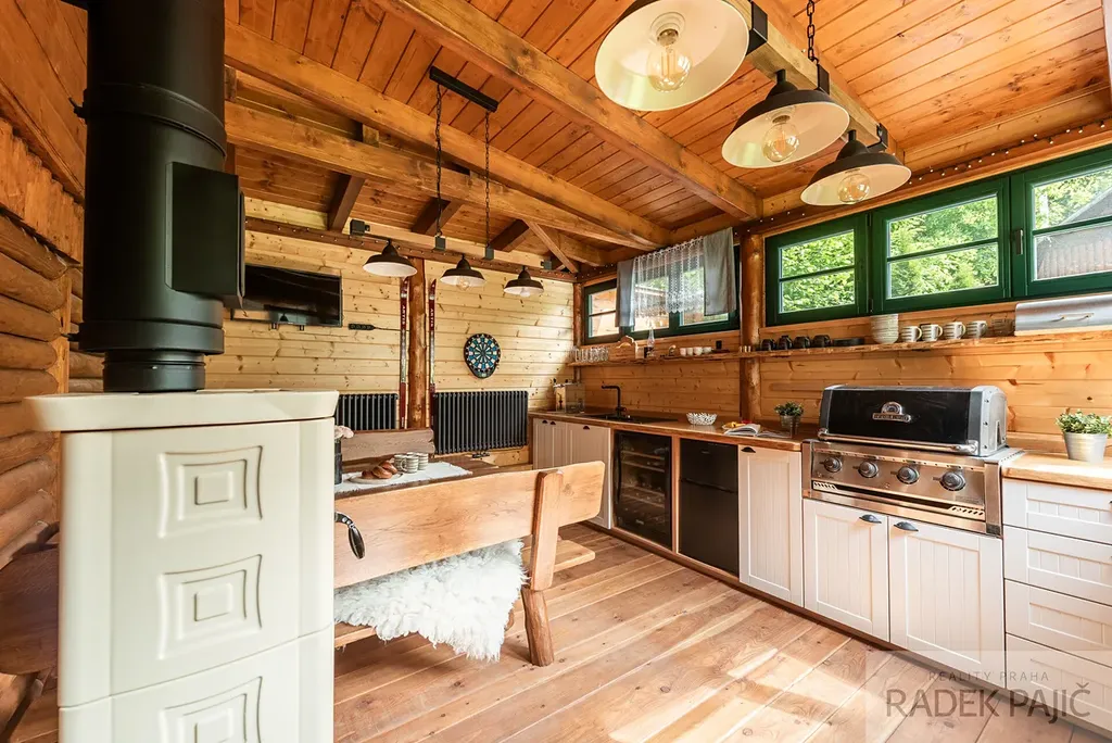 - Dvě plně vybavené kuchyně (v chatě i v pergole), betonové dřezy Blanco, spotřebiče Gorenje