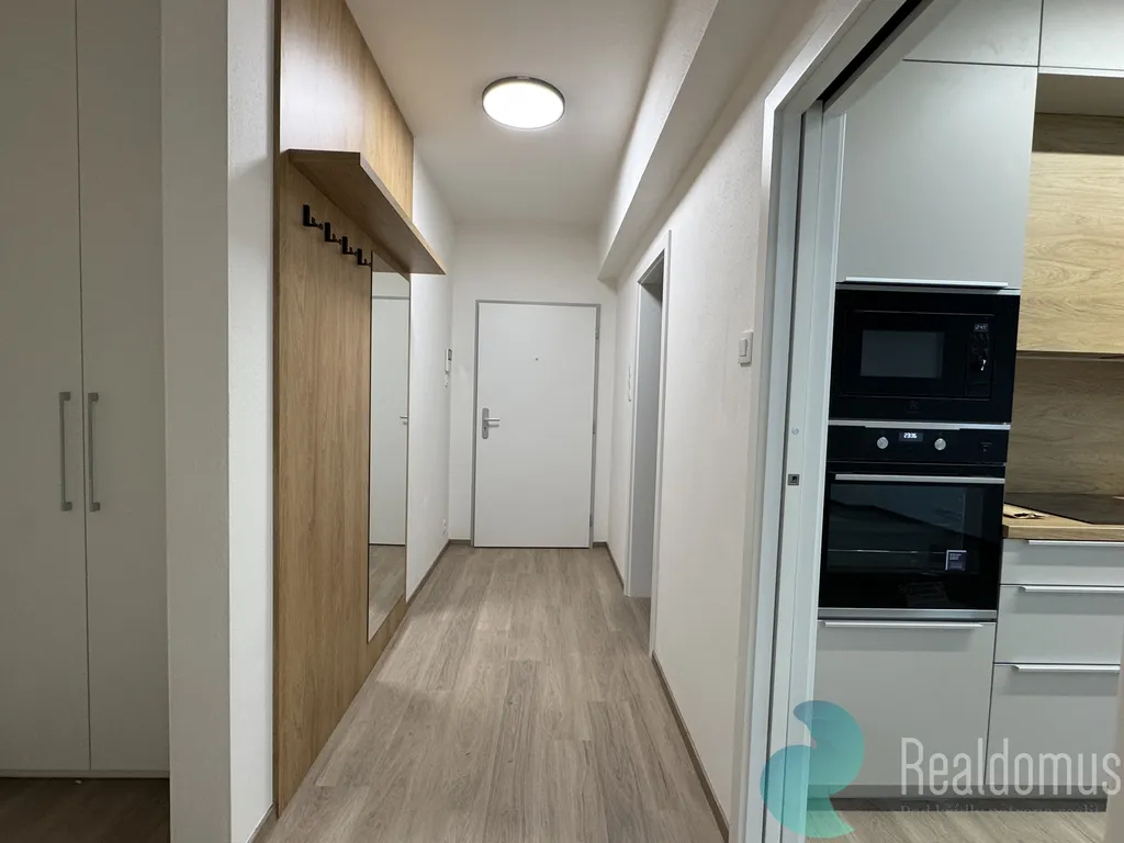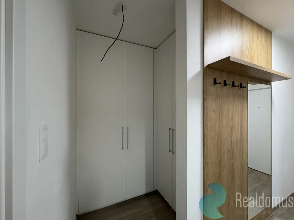 Interiér bytu je řešen promyšleně a s citem pro detail. Vstupní část nabízí vestavěné skříně s velkým úložným prostorem, díky nimž zůstává byt vzdušný a přehledný. Koupelna s toaletou o celkové výměře (5,73 m²) je plně vybavena sprchovým koutem, toaletou, zrcadlem s úložným prostorem a nabízí prakticky řešený prostor připravený pro umístění pračky.