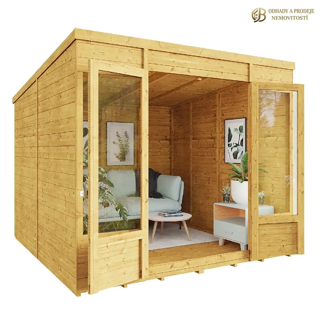 Nabízíme nový zahradní dřevěný domek na nářadí o podlahové ploše 9 m² (3 × 3 m). Celkové maximální rozměry domku jsou 3,1 × 3,1 m, výška cca 2,1 m.