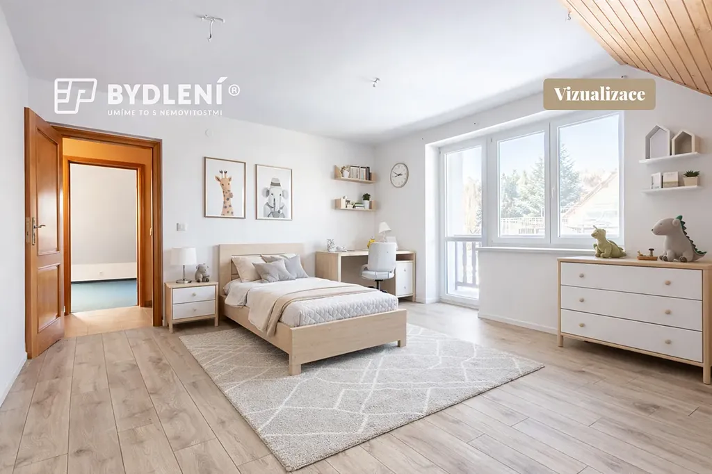 Druhé nadzemní podlaží nabízí tři další pokoje a druhou koupelnu, což poskytuje dostatek soukromí pro jednotlivé členy rodiny, hosty nebo práci z domova.
