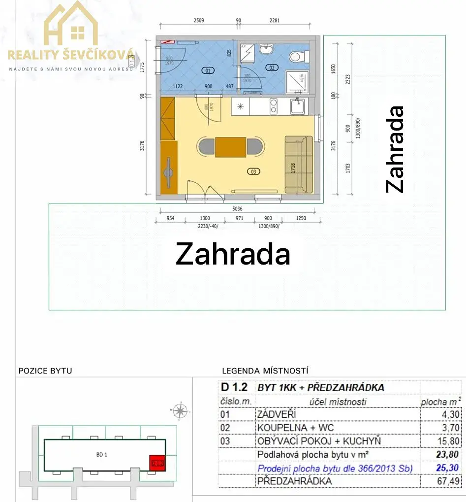 Nabízíme pronájem bytové jednotky o dispozici 1+kk s předzahrádkou, který se nachází v novostavbě bytového domu v ulici Nádražní v Hrochově Týnci. Výměra jednotky činí 25 m2 a disponuje vstupní chodbou, koupelnou se sprchovým koutem a WC, centrálním pokojem s kuchyňským koutem a přímým vstupem na předzahrádku o výměře 68 m2.