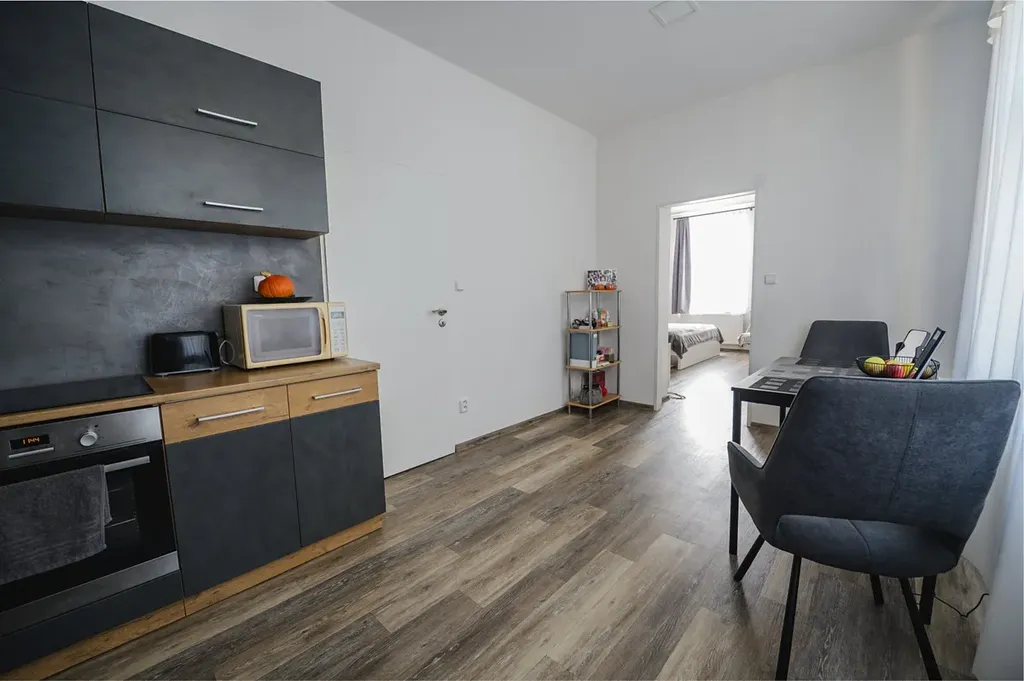 Kuchyňská linka je rohová s vestavěnými spotřebiči ( elektrická varná deska, elektrická trouba), v kuchyni jsou také 2 okna. Byt je tedy slunný a světlý. Byt v posledních 3 letech prošel kompletní rekonstrukcí. Jsou zde nové podlahy, včetně izolace, nová elektřina, nové štuky, dveře, okna. V bytě je rekuperace. Byt má vlastní topení ( elektrokotel ).Náklady na elektřinu cca 2.500,-Kč / měsíčně. V domě je plyn, plynová přípojka je hned před bytem - možnost připojení i na plyn. V domě je založené SVJ a postupně zde proběhli i společné opravy. U domu je zahrada, parkování je před domem. K bytu patří sklepní koje v suterénu domu.