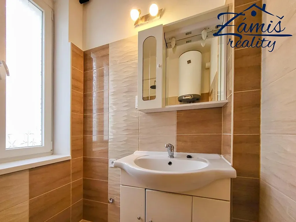 V bytě je zcelá nová koupelna s keramickými obklady a dlažbou. Je vybavena vanou se sprchovou zástěnou, umyvadlem se zrcadlem a místem pro pračku.