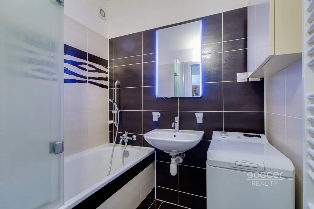 Interiér bytu byl navržen s důrazem na vkus, kvalitu a praktičnost a je nabízen jako kompletně zařízený. Dominantou je plně vybavená kuchyňská linka se všemi moderními spotřebiči. Byt je vybaven i vestavěnými skříněmi, které nabízejí dostatek úložného prostoru a šetří místo v místnostech. Koupelna disponuje klasickou vanou, toaleta je řešena samostatně. V ceně nájmu je již zahrnuto internetové připojení.