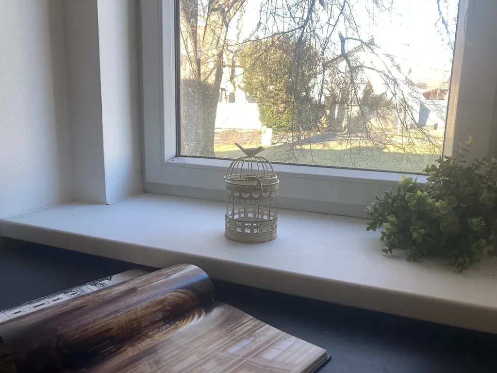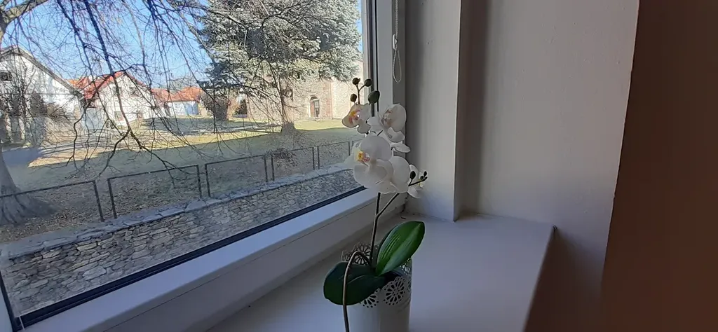 Okna jsou nová, plastová a je z nich úžasný výhled do parčíku s kapličkou.