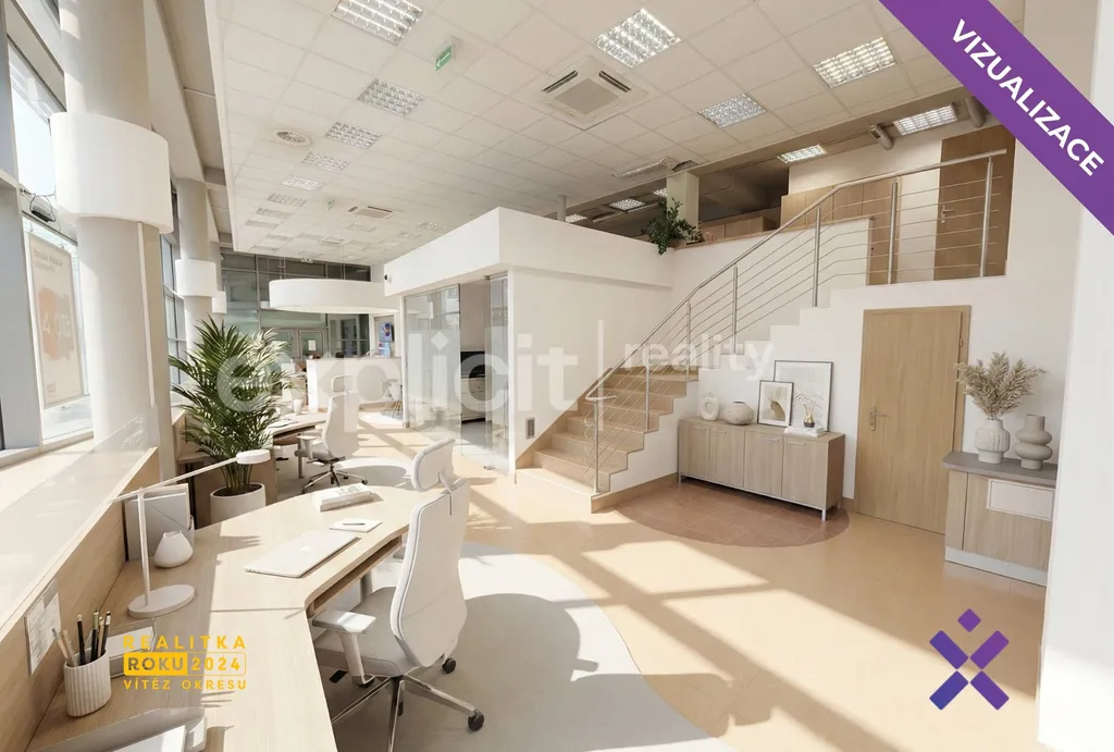 Dále k prostorům náleží samostatná kancelář, další prostory ve zvýšené galerii, kuchyňka, a sociální zázemí s vlastní toaletou. Prostory slouží k obchodním účelům a lze je využít např. jako butik, showroom, prodejna nebo obchodní kancelář. Současně mohou prostory sloužit jako atraktivní prostor pro pobočku Vaší společnosti, nebo jiné kontaktní místo s veřejností pro pojišťovny, cestovní kanceláře apod. Prostory se nabízí bez vybavení.