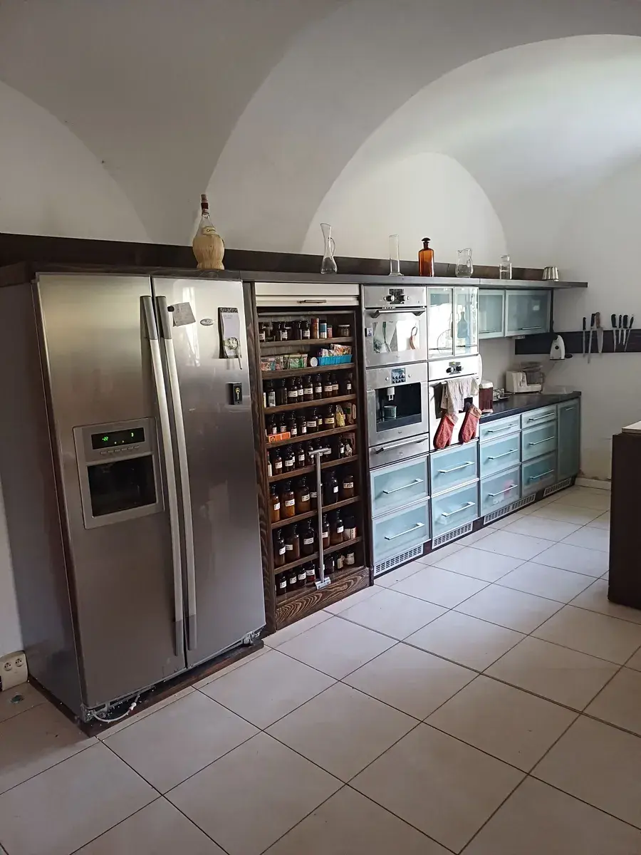 V 1.NP se nachází jídelna s klenutými stropy, kuchyně s vybavenou kuchyňkou linkou, dvoudílnou americkou lednicí, mikrovlnnou troubou, kombinovanou varnou deskou, ohřívacím šuplíkem, kávovarem a elektrickou troubou, posezení u krbu na tuhá paliva a otočné schodiště vedoucí do 2.NP.