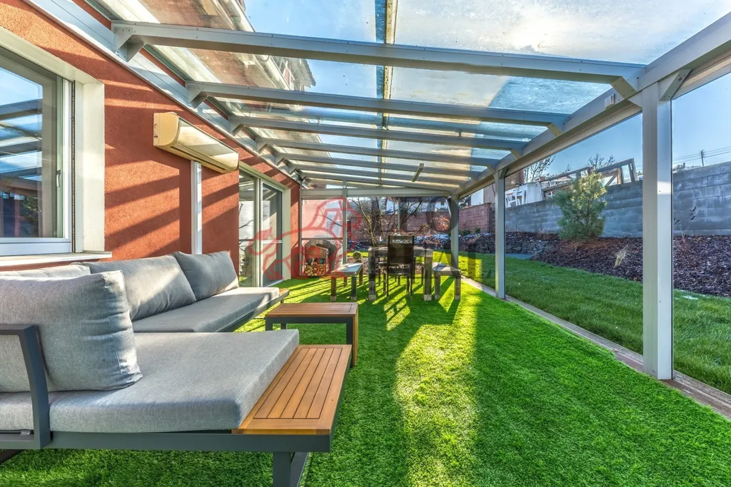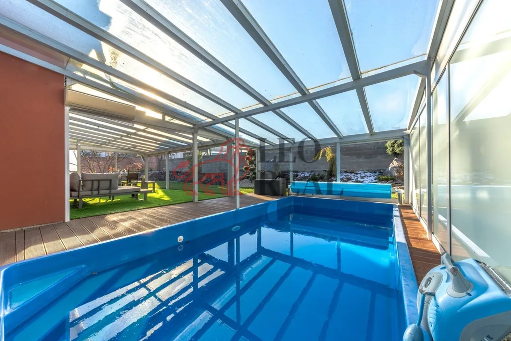Bazén je zastřešen pod pergolou, což umožňuje jeho celoroční využití, a poskytuje osvěžení i v zimních měsících.