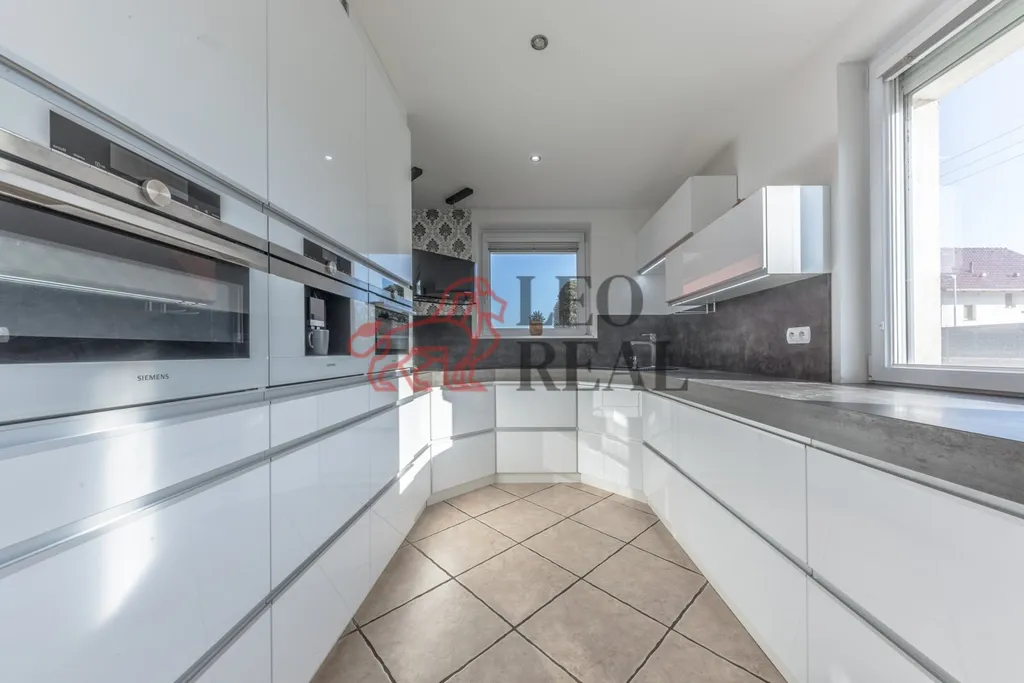 Kuchyně je plně vybavena nejmodernějšími spotřebiči značky Siemens, včetně indukční varné desky, vestavné trouby, vest. mikrovlnné trouby a kávovaru, myčky nádobí a lednice. Kuchyňská linka je vyrobena z kvalitních materiálů a nabízí dostatek úložného prostoru.