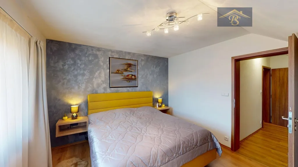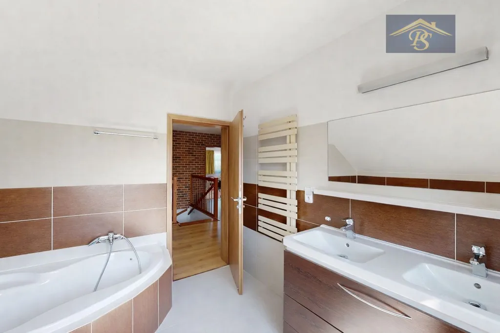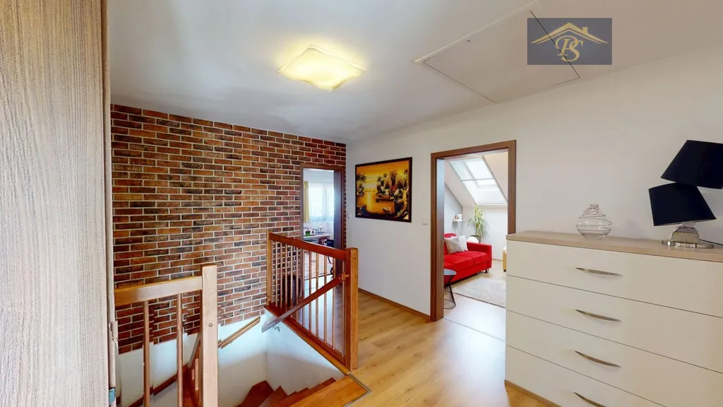 V patře se nacházejí čtyři samostatné pokoje, šatna a koupelna s vanou.