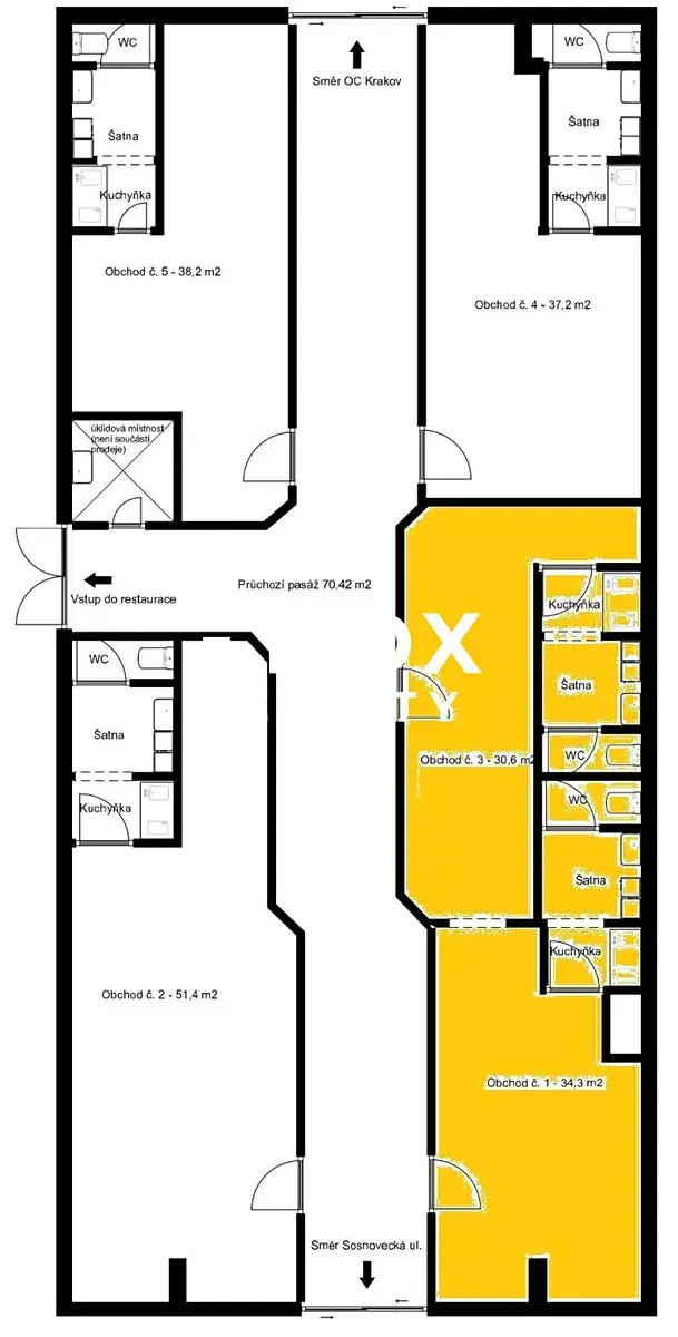 Prostor se nachází v průchozí pasáži s komerčními jednotkami, která slouží jako spojnice směrem k OC Krakov, což zajišťuje výbornou frekvenci kolemjdoucích.
