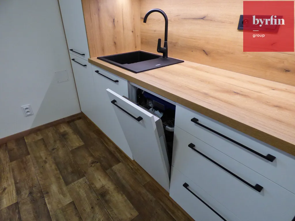 Dominantou bytu je nová kuchyňská linka vybavená vestavěnými spotřebiči značky Philco – lednice s mrazákem, myčka, varná deska s troubou, digestoř a mikrovlnná trouba.