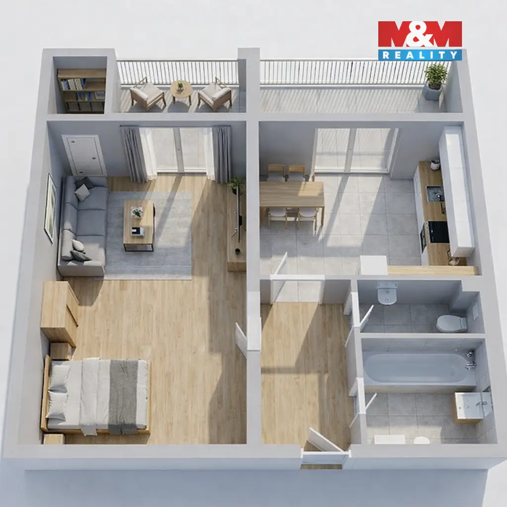 Dispozice bytu nabízí dva samostatné pokoje. Jeden z nich lze využít jako obývací pokoj s ložnicí, druhý jako kuchyň s jídelním koutem. Velkým benefitem jsou dva balkony, které poskytují příjemné místo k odpočinku a relaxaci.