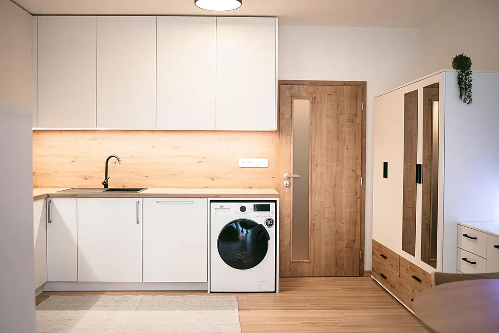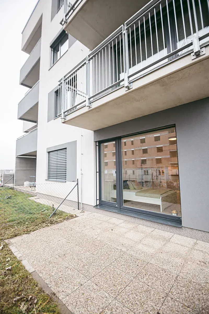 Interiér bytu tvoří hlavní obytná místnost s kuchyňskou linkou, koupelna se sprchovým koutem a toaletou a vstupní chodba. Z hlavní obytné místnosti je přímý vstup na terasu a předzahrádku. Díky velikému francouzskému oknu, které je situováno na jih budete mít ve Vašem novém domově slunce po celý den. O soukromí se postarají venkovní elektrické rolety. Truhlářem na míru vyrobená kuchyňská linka disponuje kvalitními vestavěnými spotřebiči – myčkou, troubou na pečení, pračkou a volně stojící lednicí s mrazákem. O úložný prostor se bát nemusíte. V bytě je prostorná šatní skříň, odkládací komoda se šuplíky a policová skříňka oddělující prostor kuchyně od manželské postele s matracemi. V kuchyňské části je kulatý jídelní stůl se židlemi. Atmosféru dokresluje plovoucí podlaha s dřevěným dekorem. Součástí nabídky je prostorný sklep a venkovní parkovací stání.