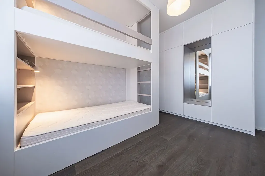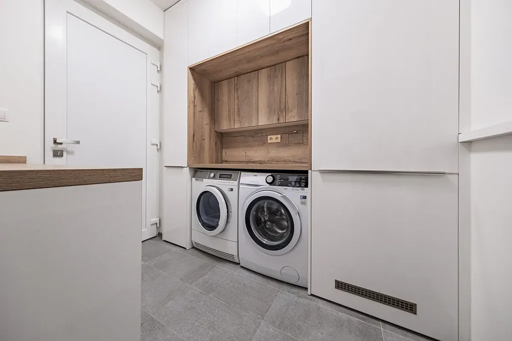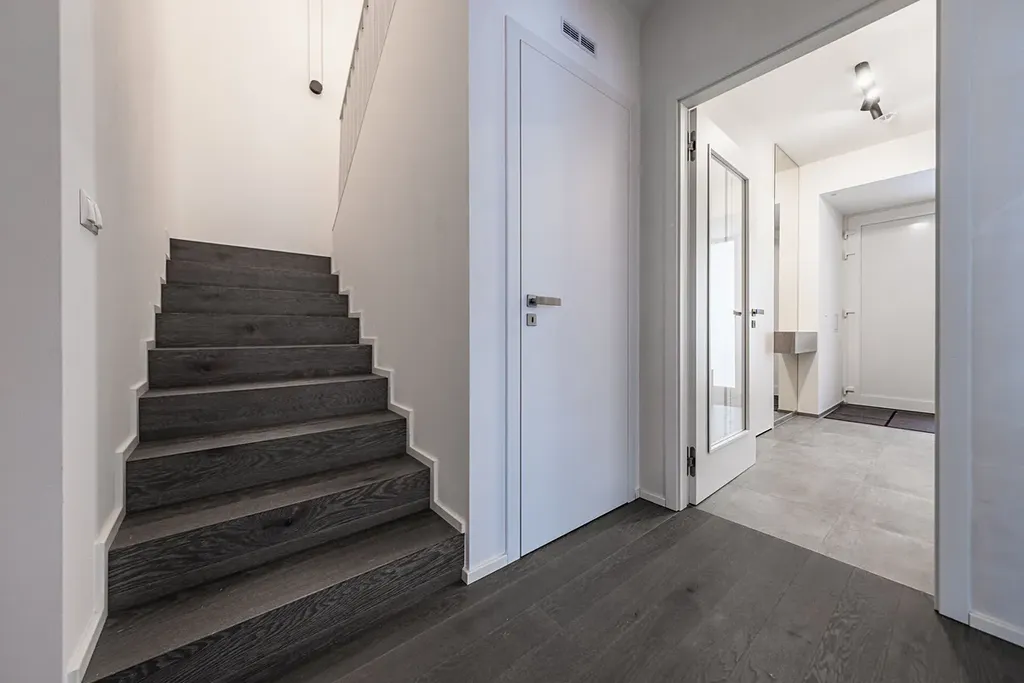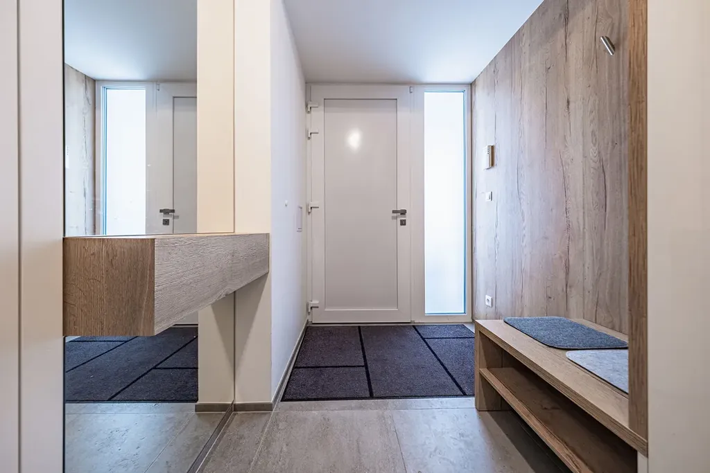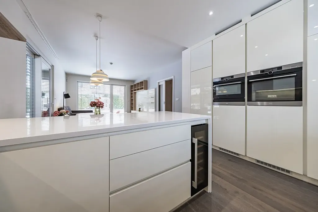 Interiér domu je kompletně řešen na míru truhlářem – od vestavěných skříní, přes elegantní úložné prostory v každém koutě domu až po luxusní kuchyňskou linku s moderními technologiemi a vinotékou, která potěší i náročné milovníky vaření.